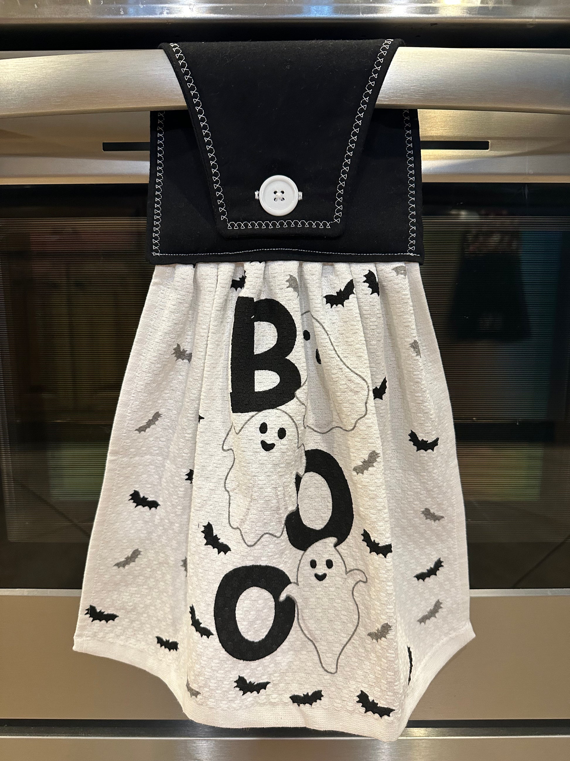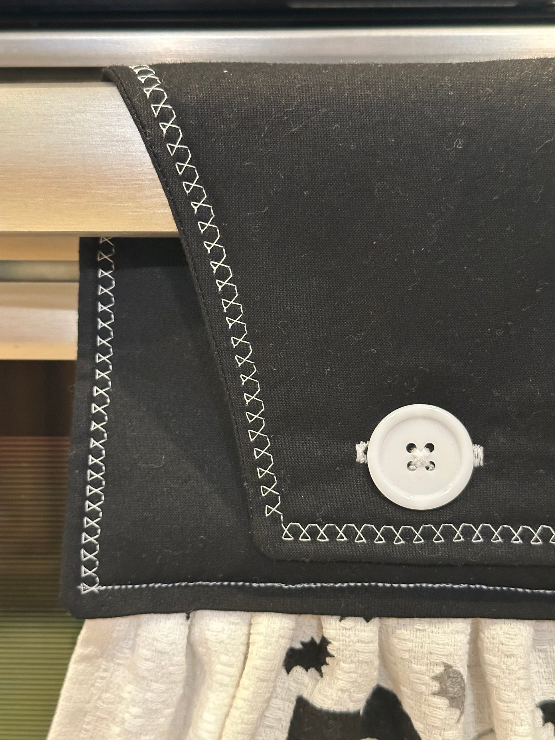This item is ready to ship to your new home! The perfect housewarming gift! The towel has a hand sewn button for you to easily hang from your stove handle.