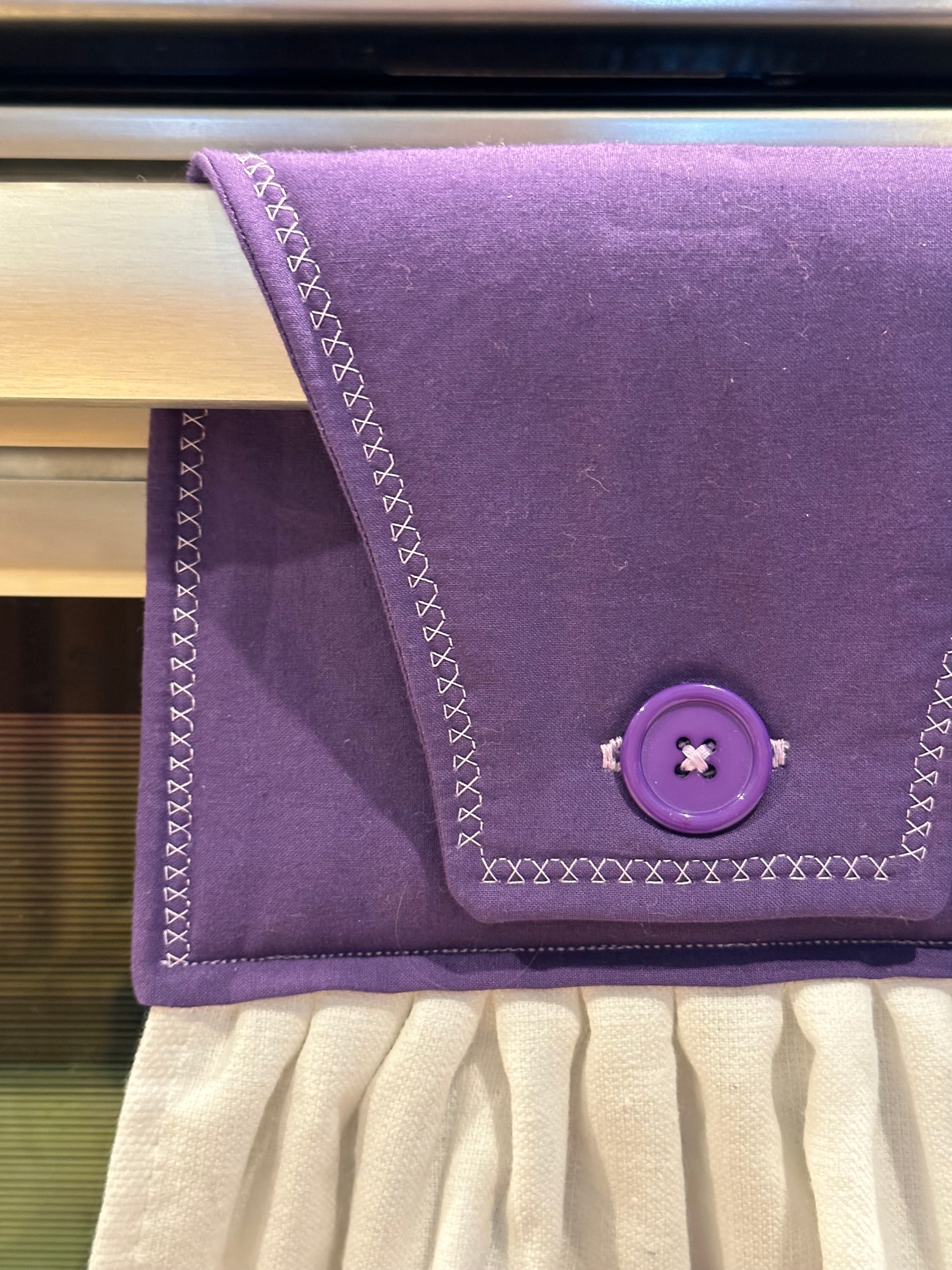 This item is ready to ship to your new home! The perfect housewarming gift! The towel has a hand sewn button for you to easily hang from your stove handle.