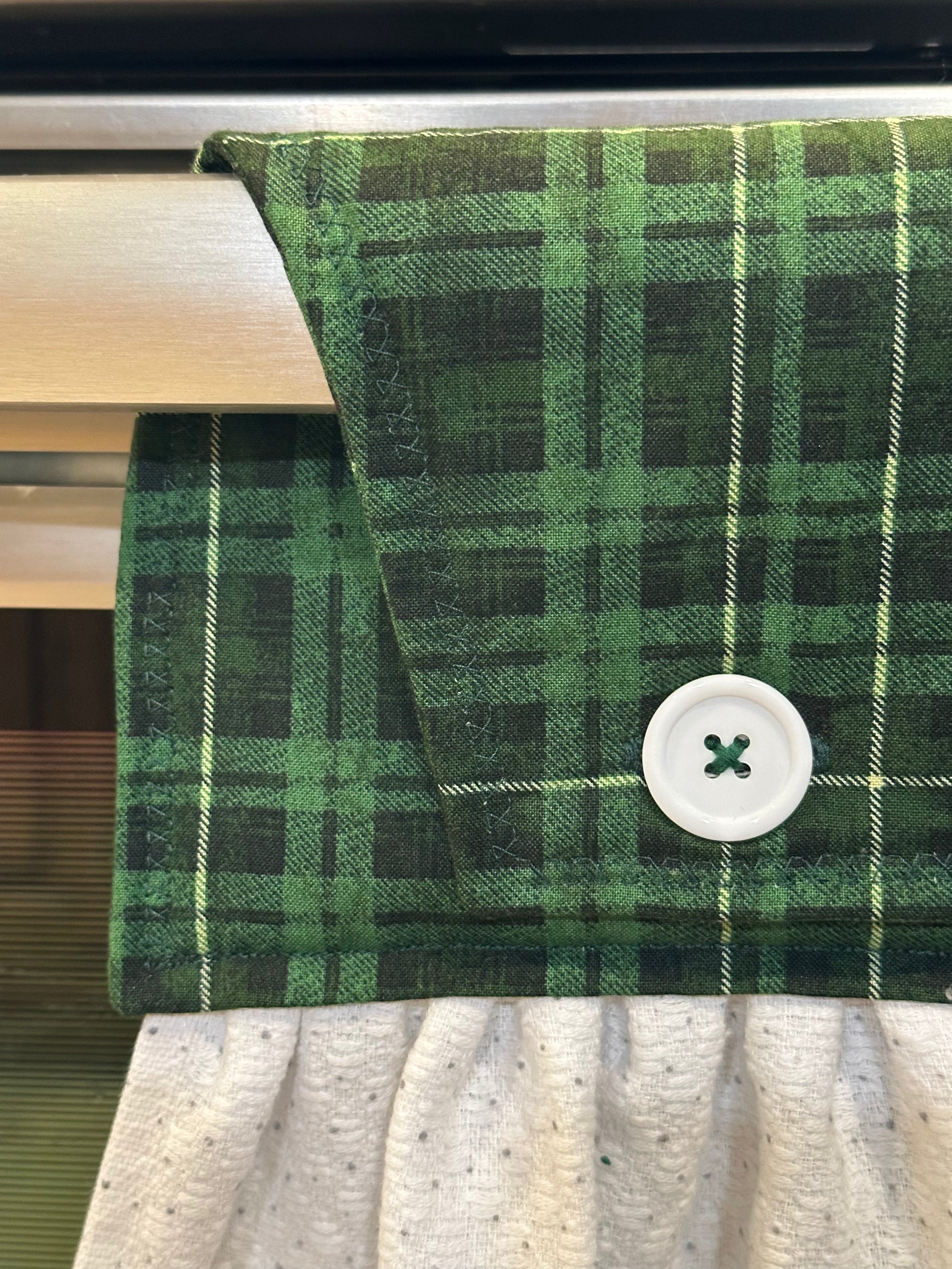 This item is ready to ship to your new home! The perfect housewarming gift! The towel has a hand sewn button for you to easily hang from your stove handle.