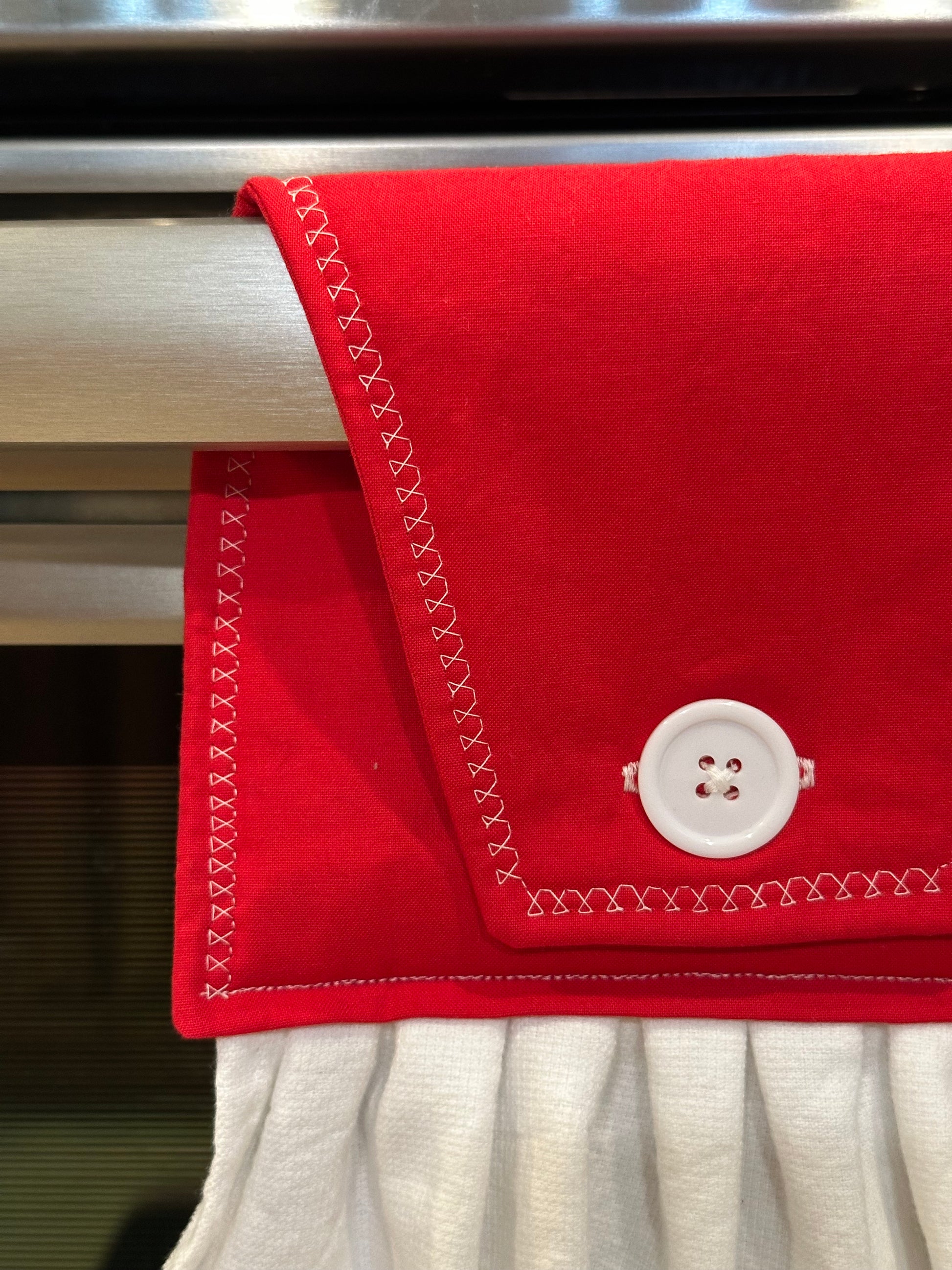 This item is ready to ship to your new home! The perfect housewarming gift! The towel has a hand sewn button for you to easily hang from your stove handle.