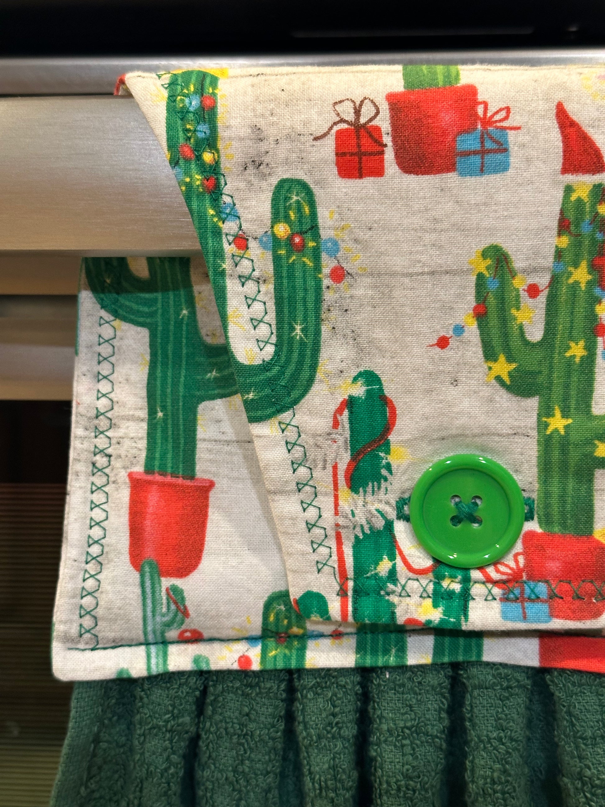 This item is ready to ship to your new home! The perfect housewarming gift! The towel has a hand sewn button for you to easily hang from your stove handle.