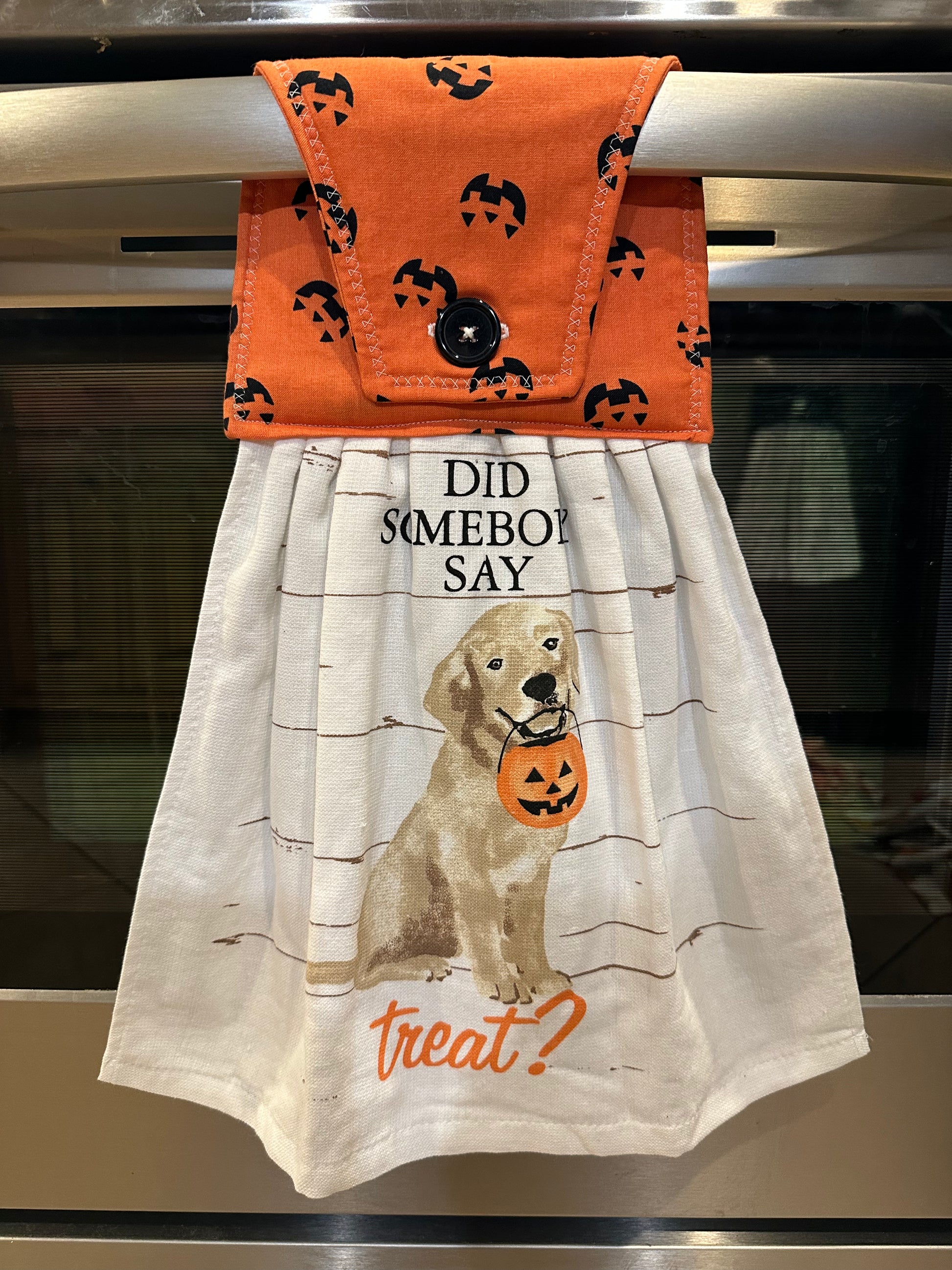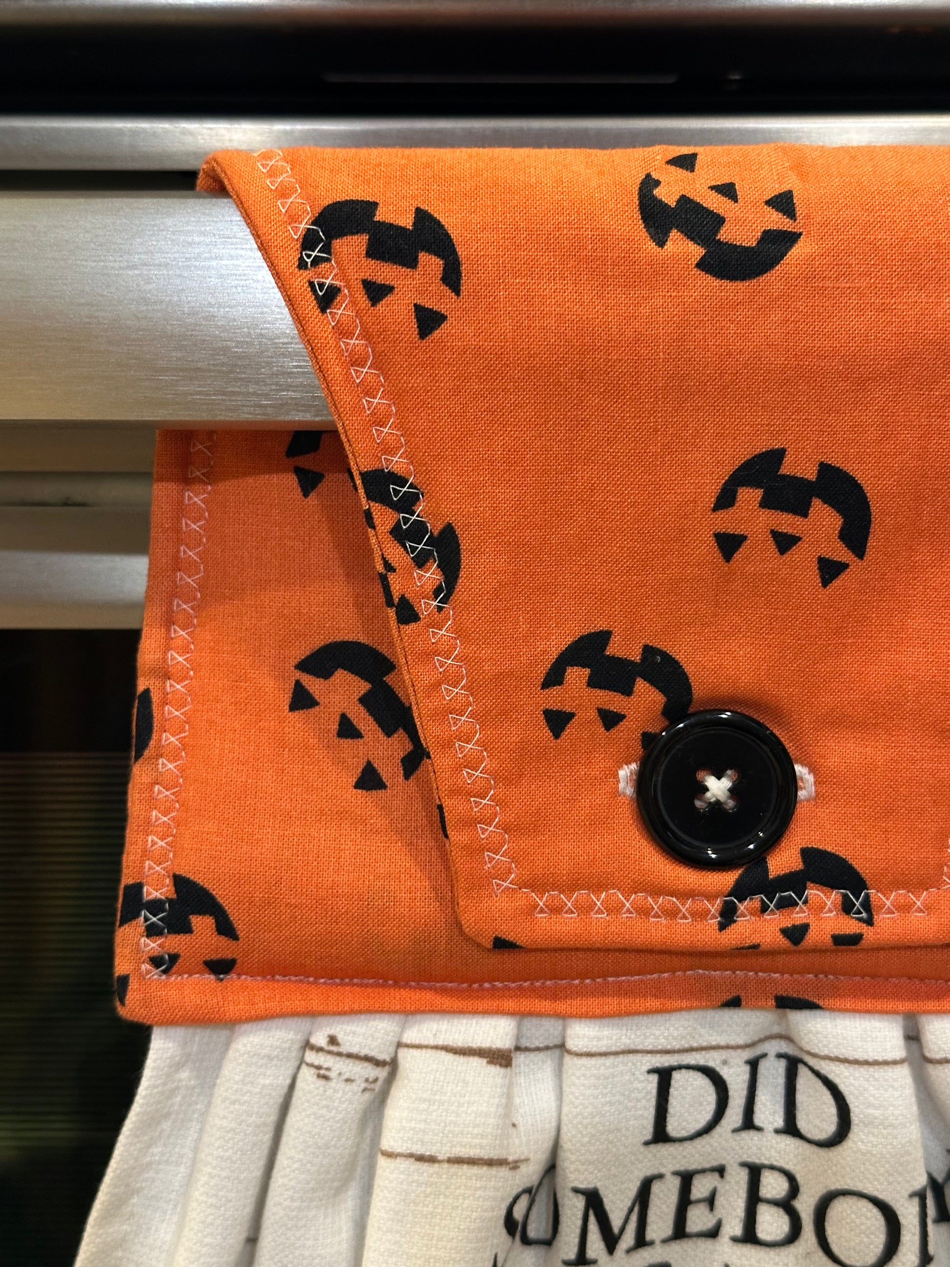 This item is ready to ship to your new home! The perfect housewarming gift! The towel has a hand sewn button for you to easily hang from your stove handle.