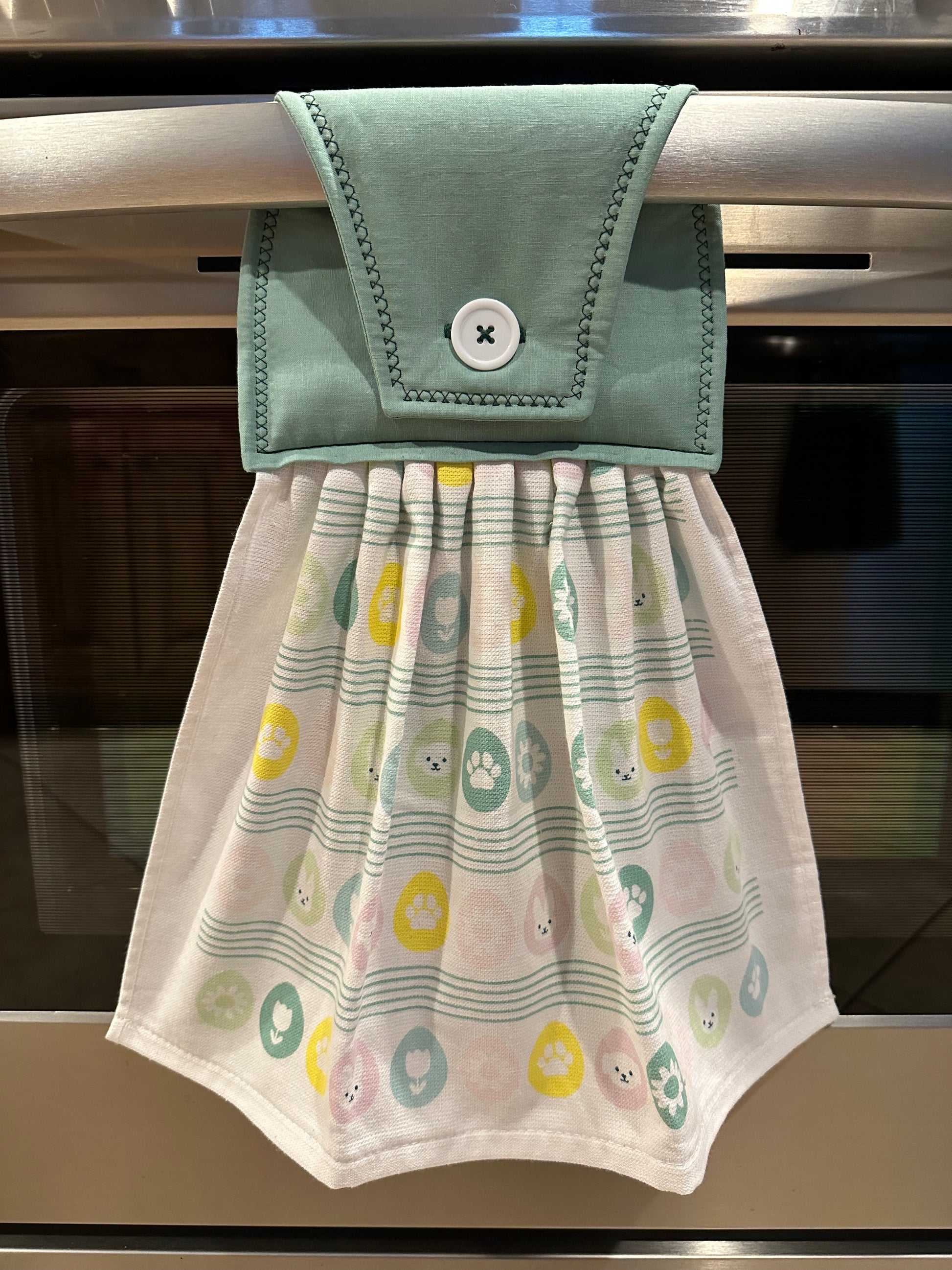 This item is ready to ship to your new home! The perfect housewarming gift! The towel has a hand sewn button for you to easily hang from your stove handle.