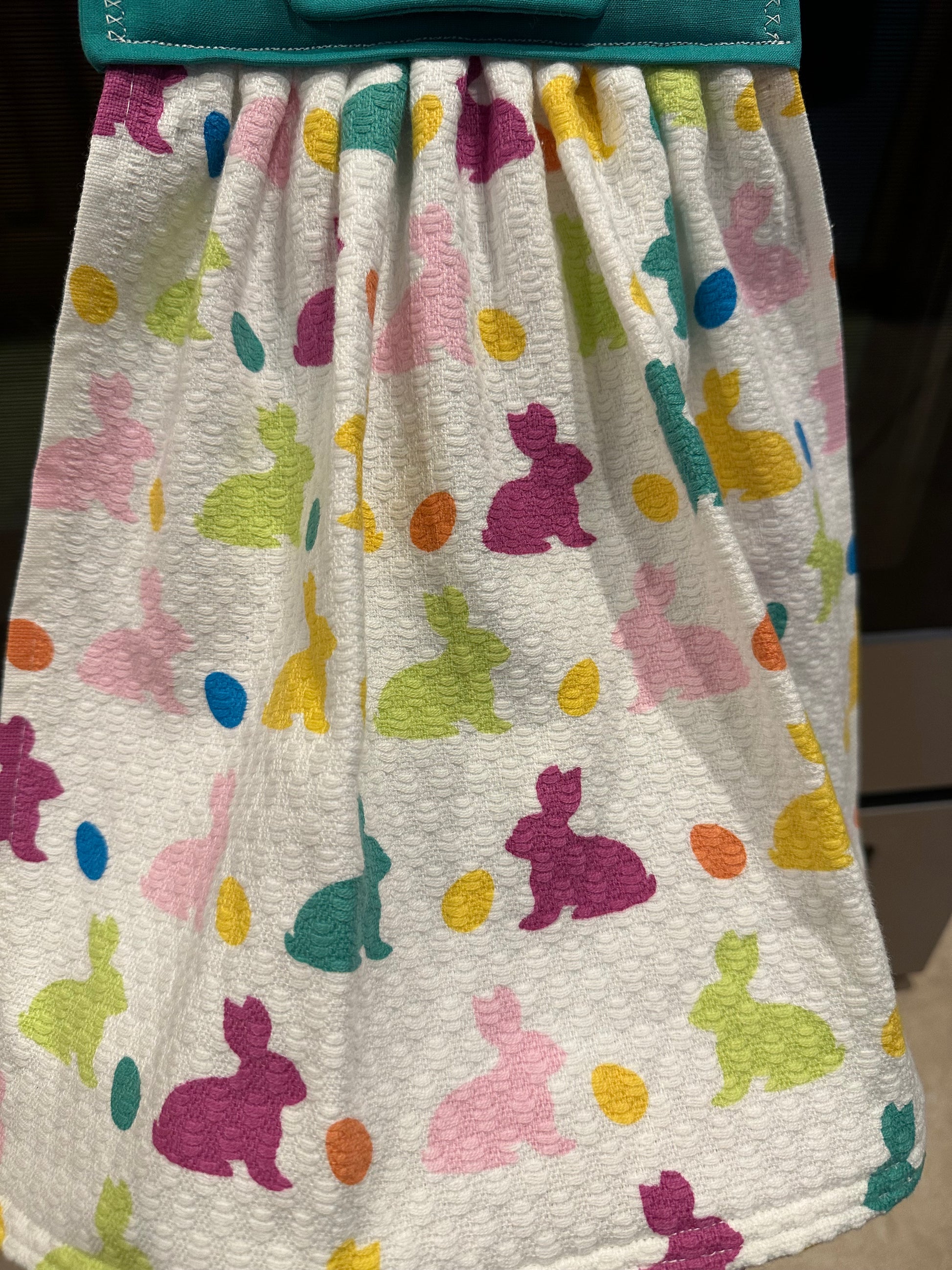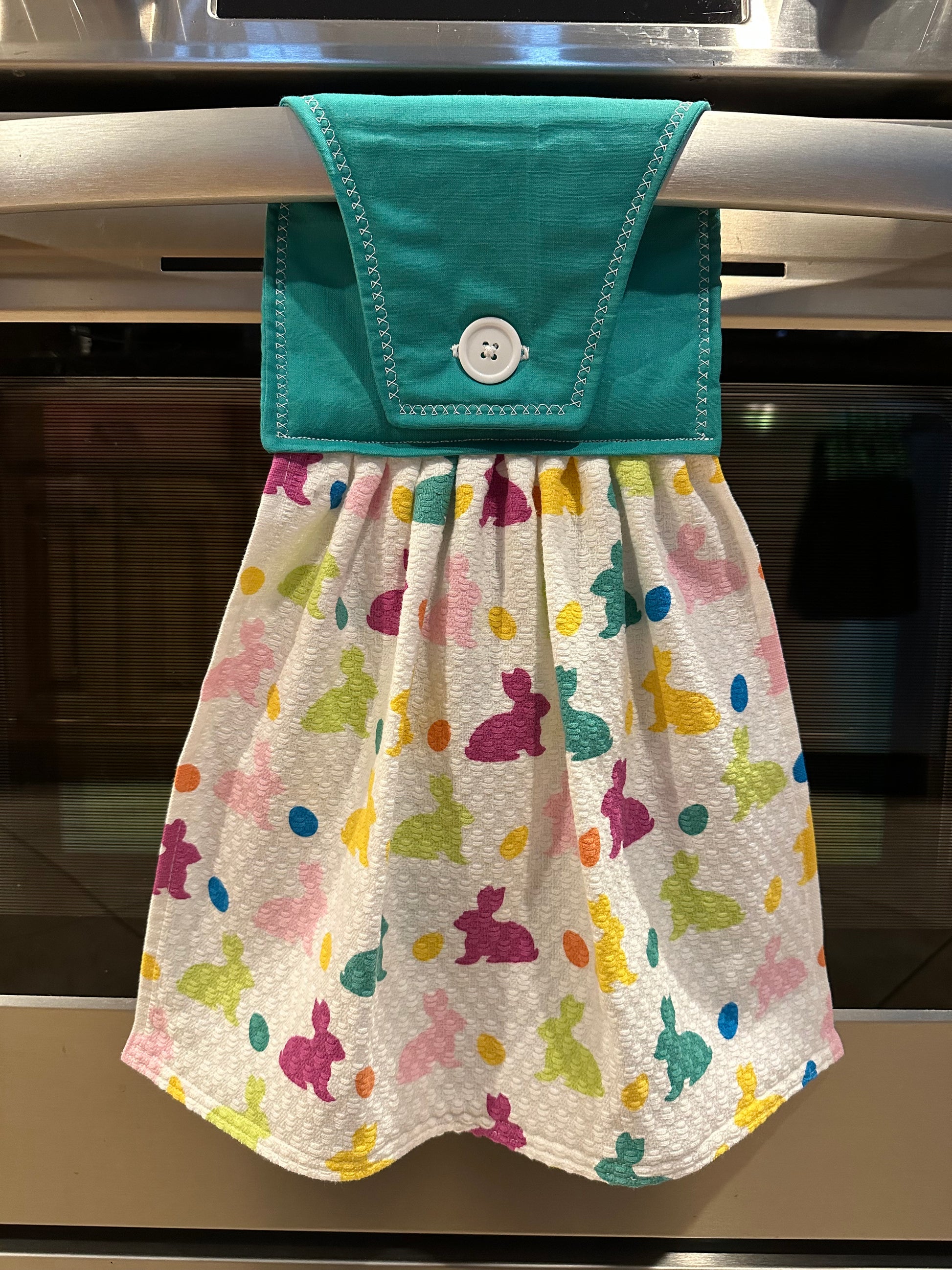This item is ready to ship to your new home! The perfect housewarming gift! The towel has a hand sewn button for you to easily hang from your stove handle.
