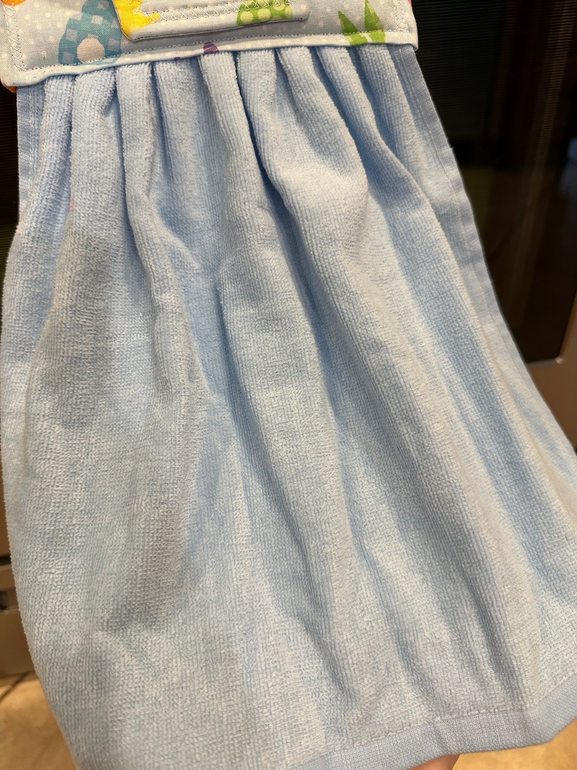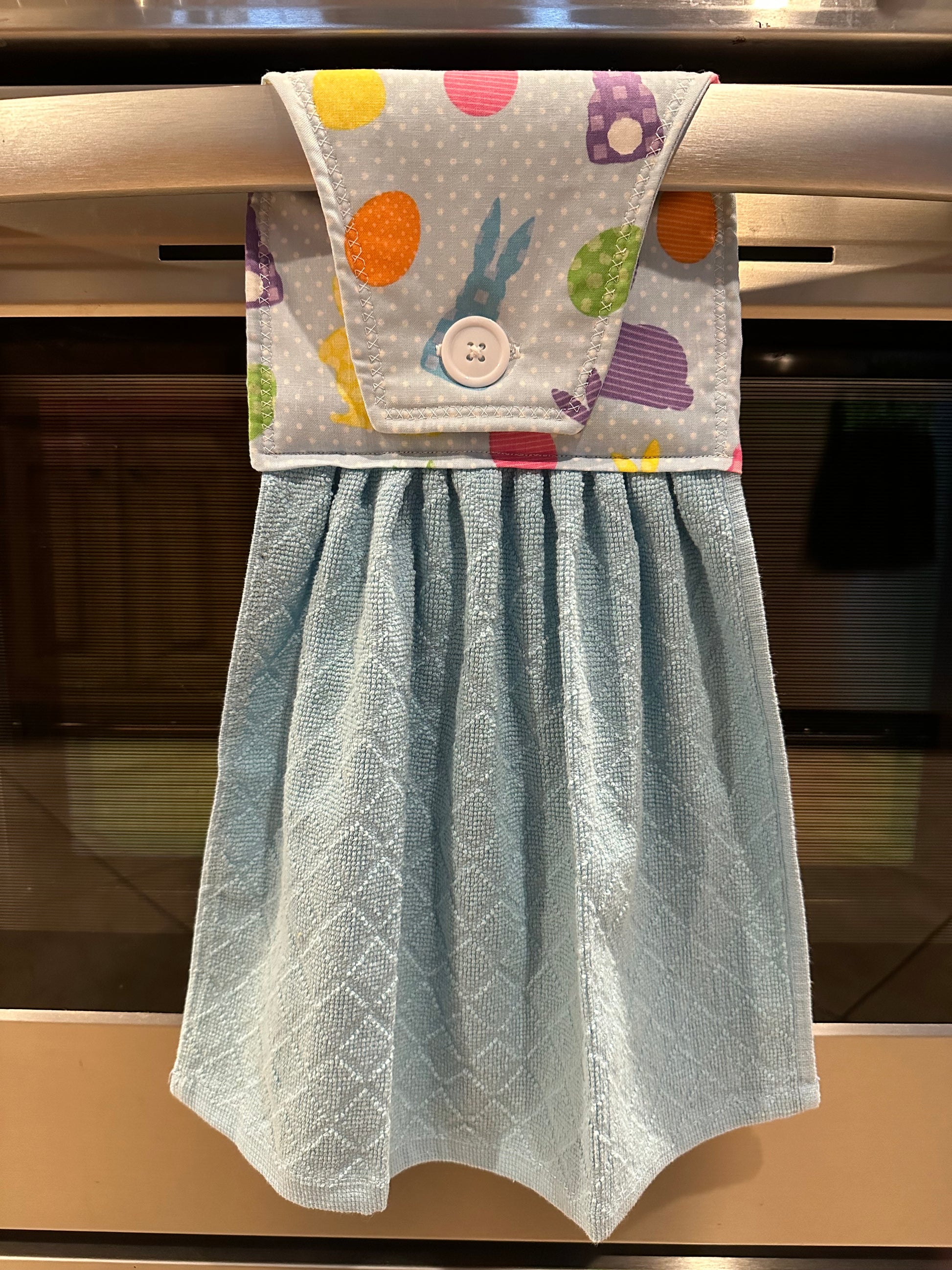 This item is ready to ship to your new home! The perfect housewarming gift! The towel has a hand sewn button for you to easily hang from your stove handle.