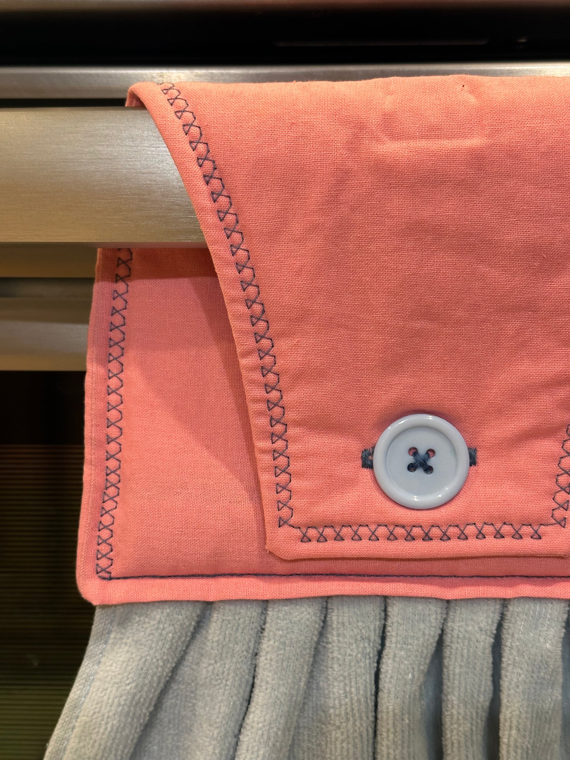 This item is ready to ship to your new home! The perfect housewarming gift! The towel has a hand sewn button for you to easily hang from your stove handle.