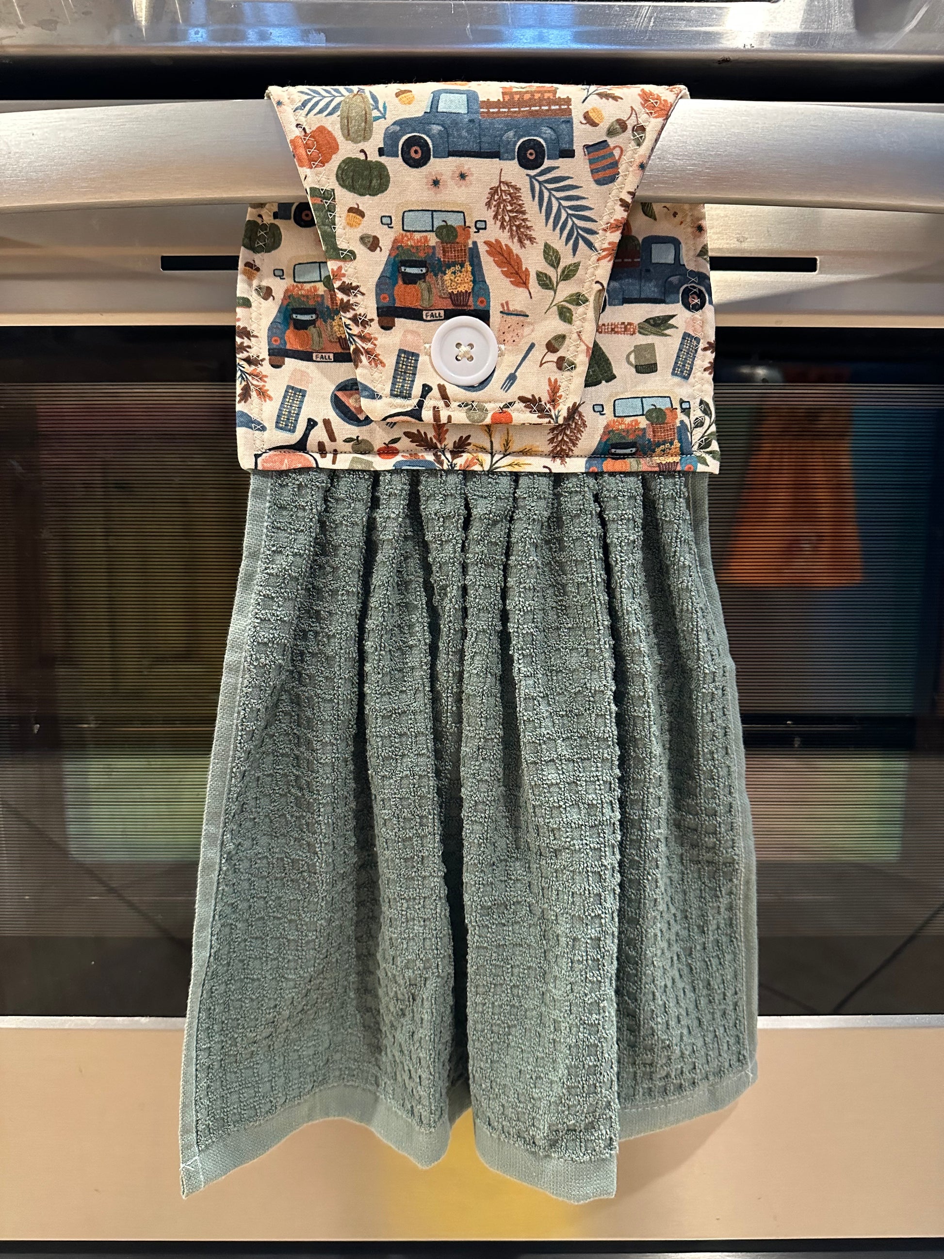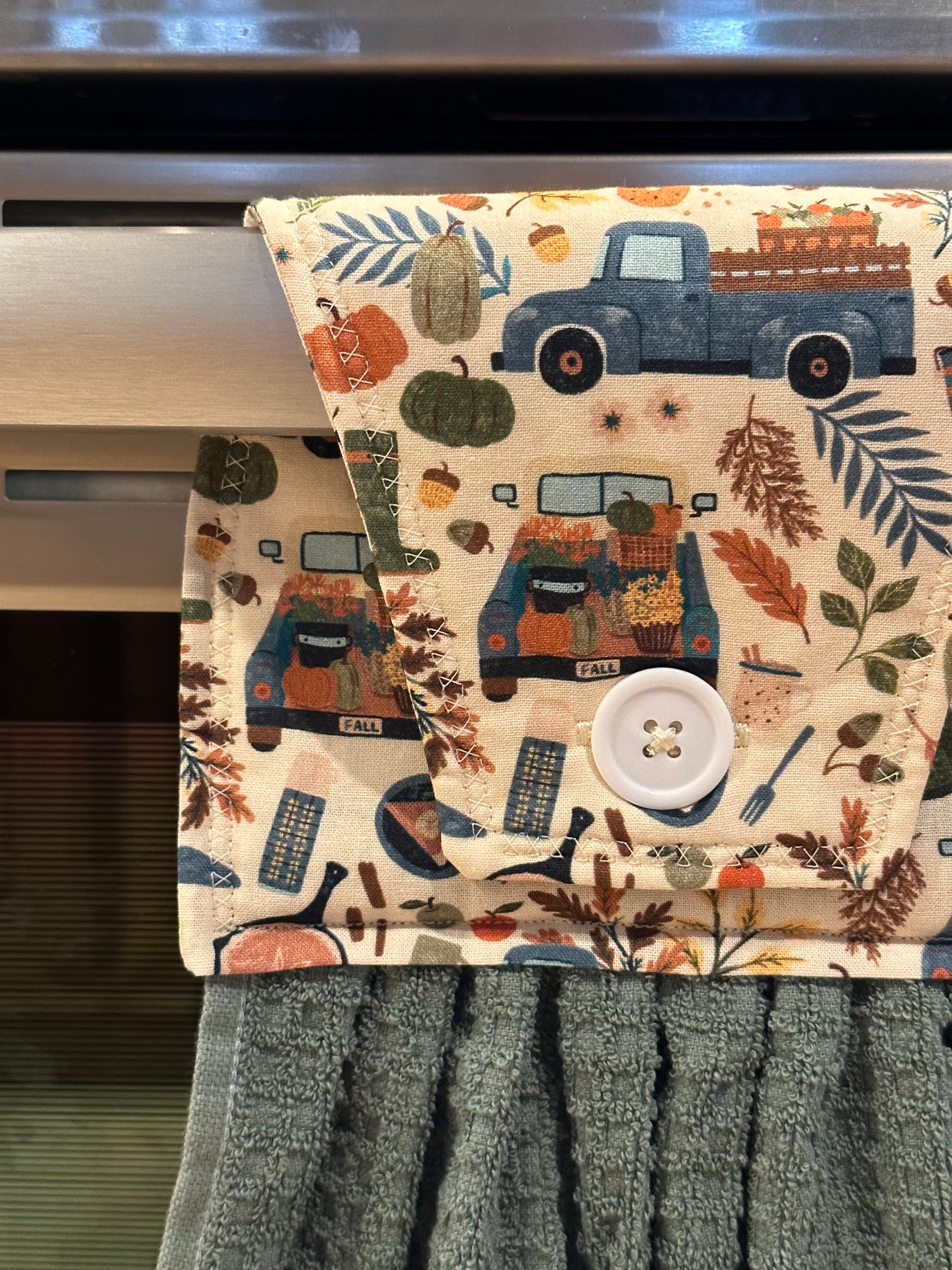 This item is ready to ship to your new home! The perfect housewarming gift! The towel has a hand sewn button for you to easily hang from your stove handle.