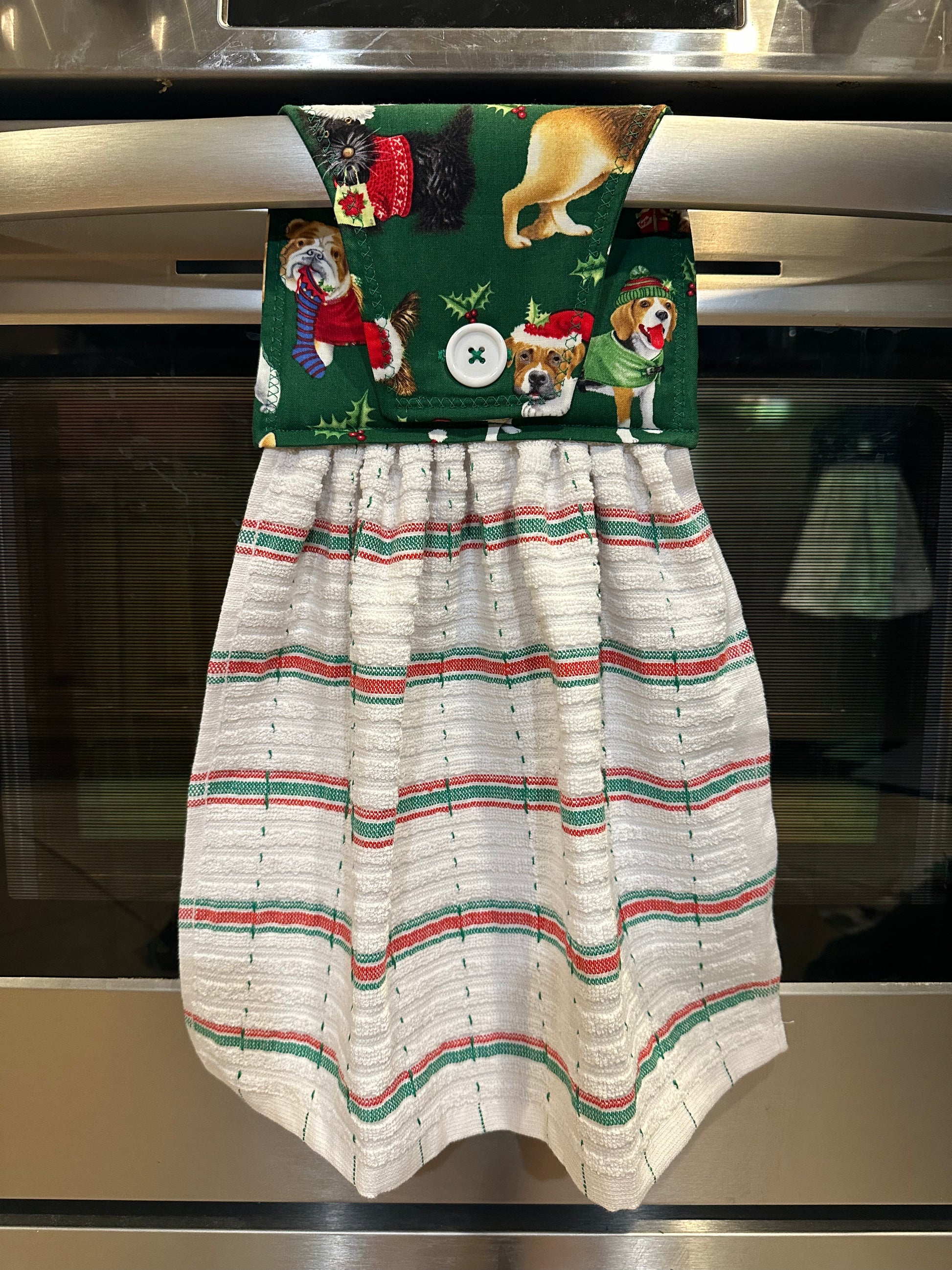 This item is ready to ship to your new home! The perfect housewarming gift! The towel has a hand sewn button for you to easily hang from your stove handle.
