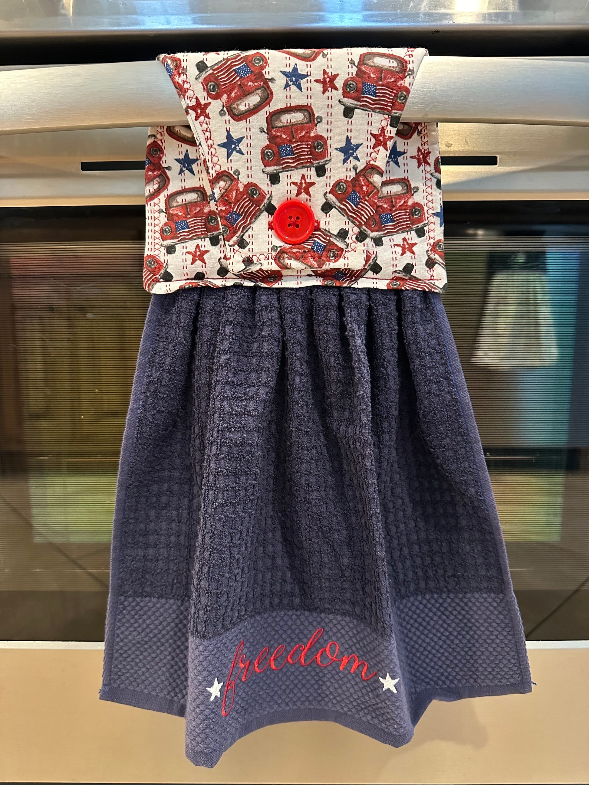 This item is ready to ship to your new home! The perfect housewarming gift! The towel has a hand sewn button for you to easily hang from your stove handle.