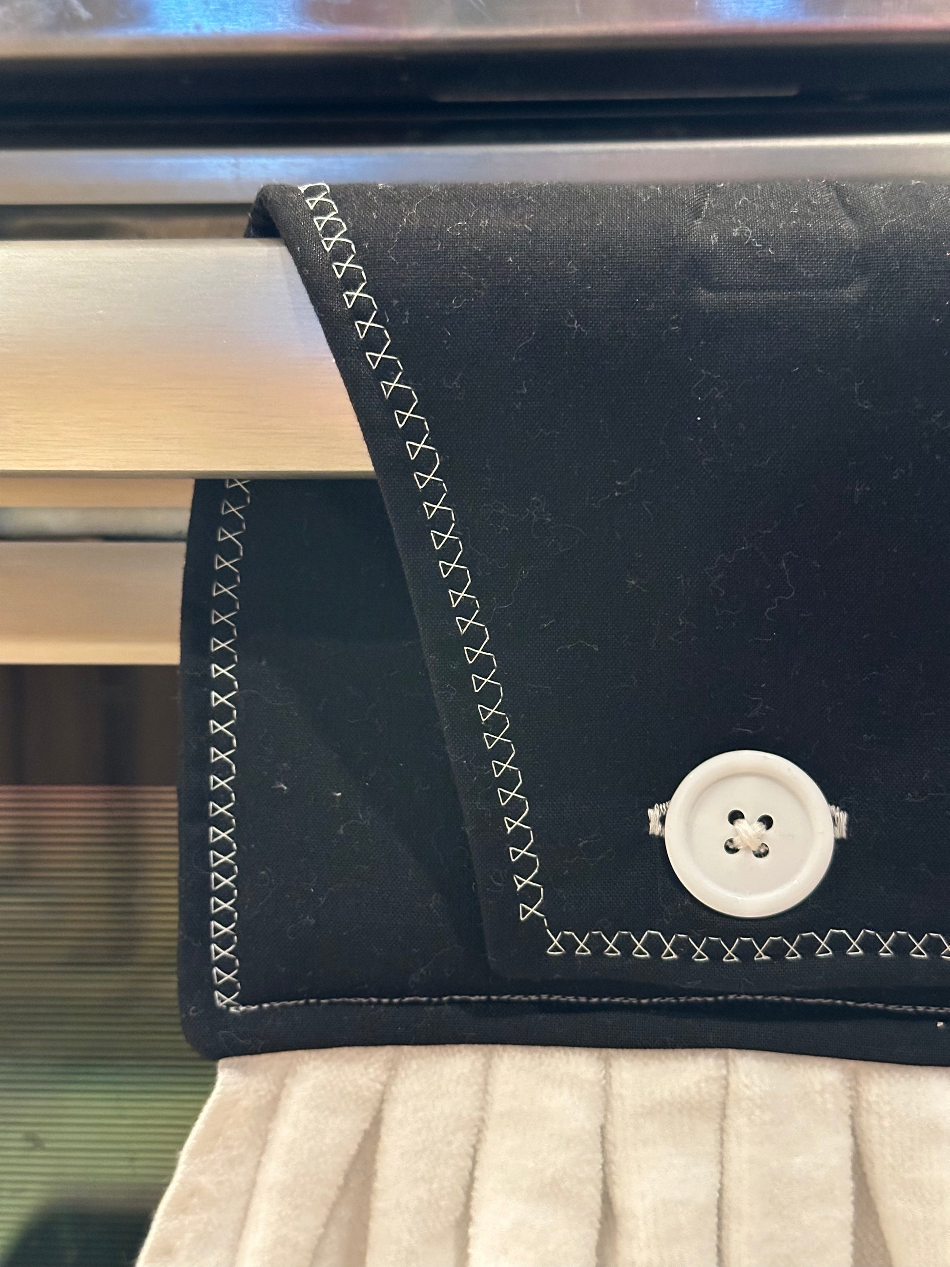 This item is ready to ship to your new home! The perfect housewarming gift! The towel has a hand sewn button for you to easily hang from your stove handle.