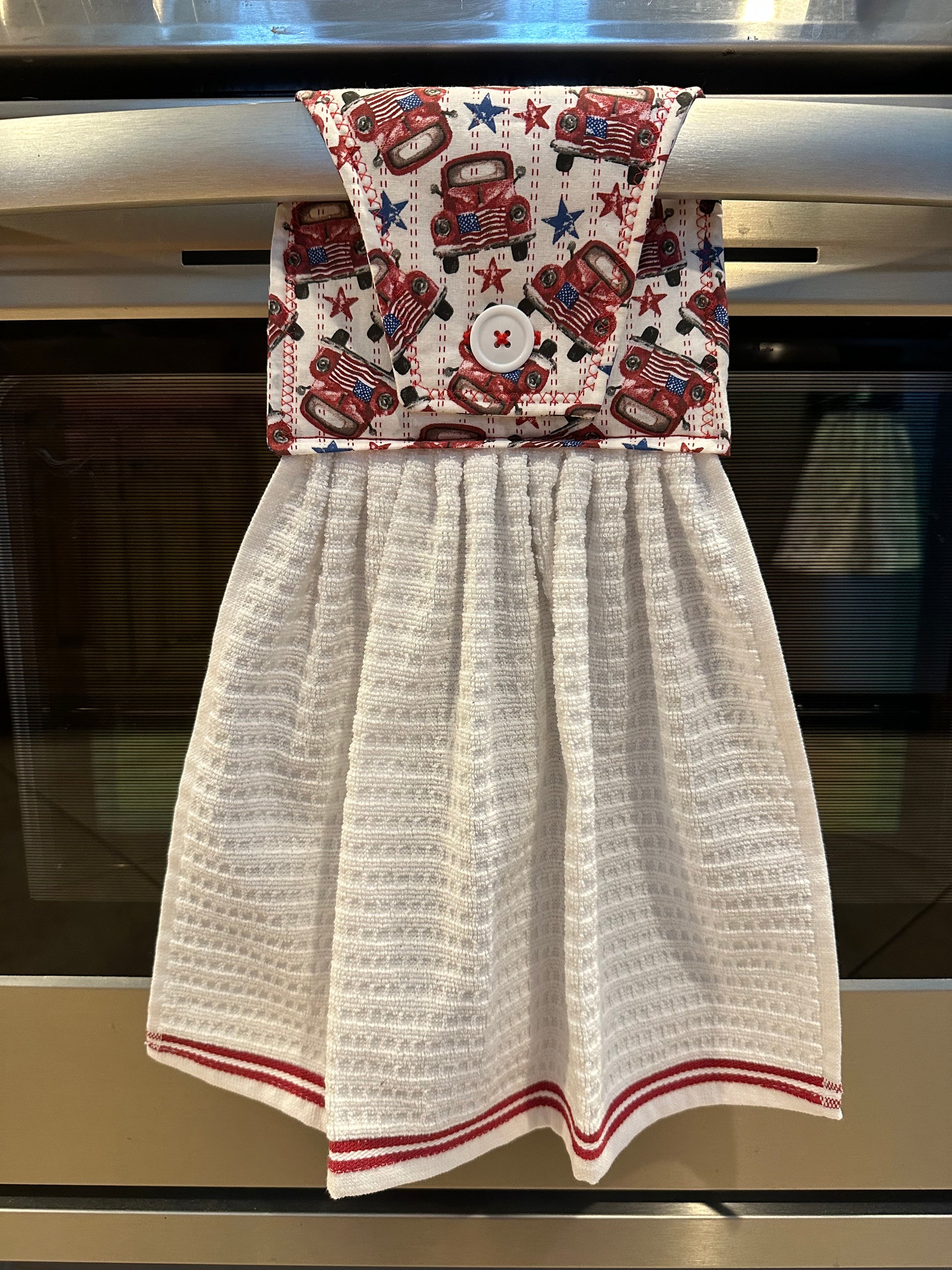 This item is ready to ship to your new home! The perfect housewarming gift! The towel has a hand sewn button for you to easily hang from your stove handle.