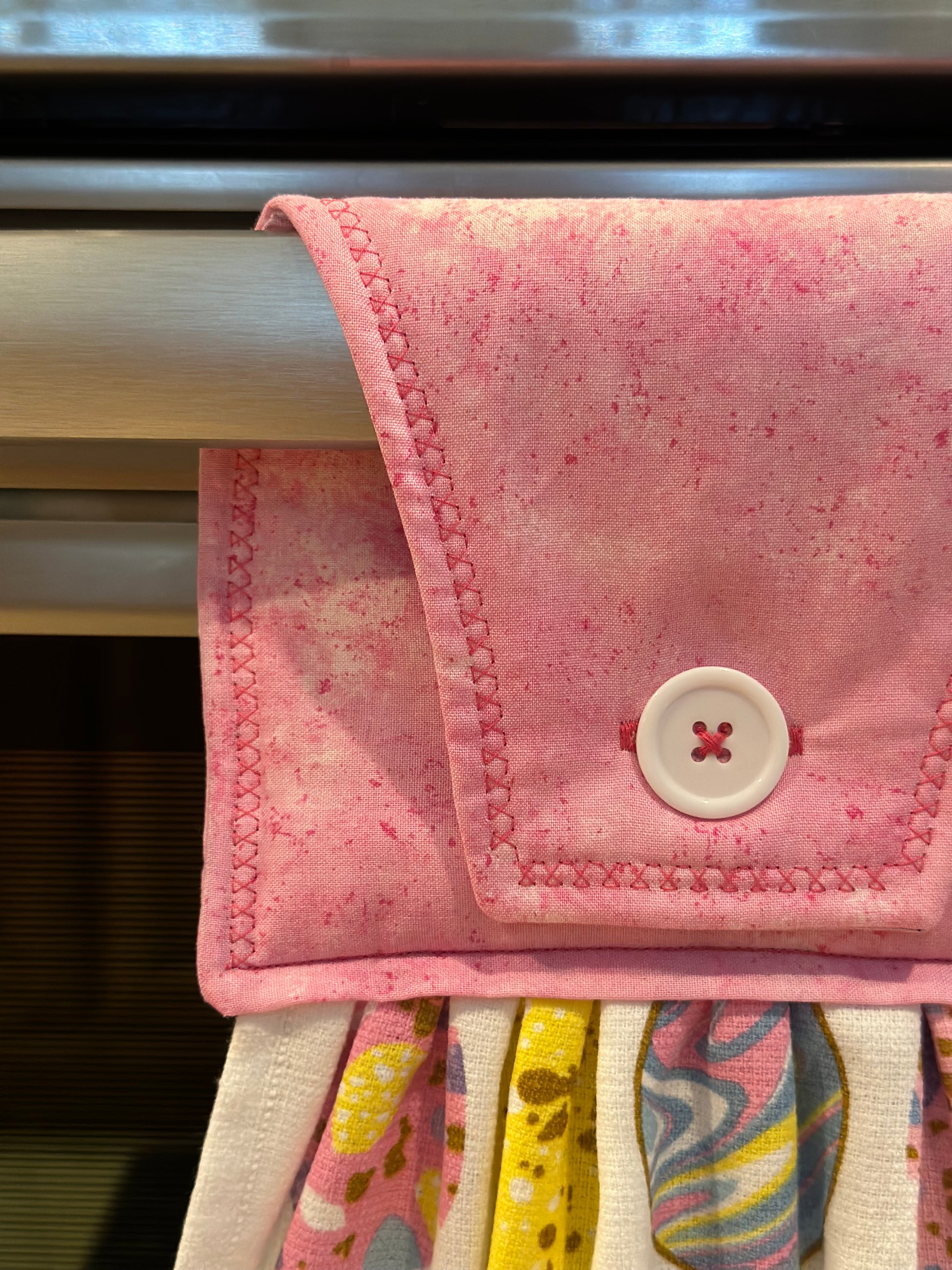 This item is ready to ship to your new home! The perfect housewarming gift! The towel has a hand sewn button for you to easily hang from your stove handle.