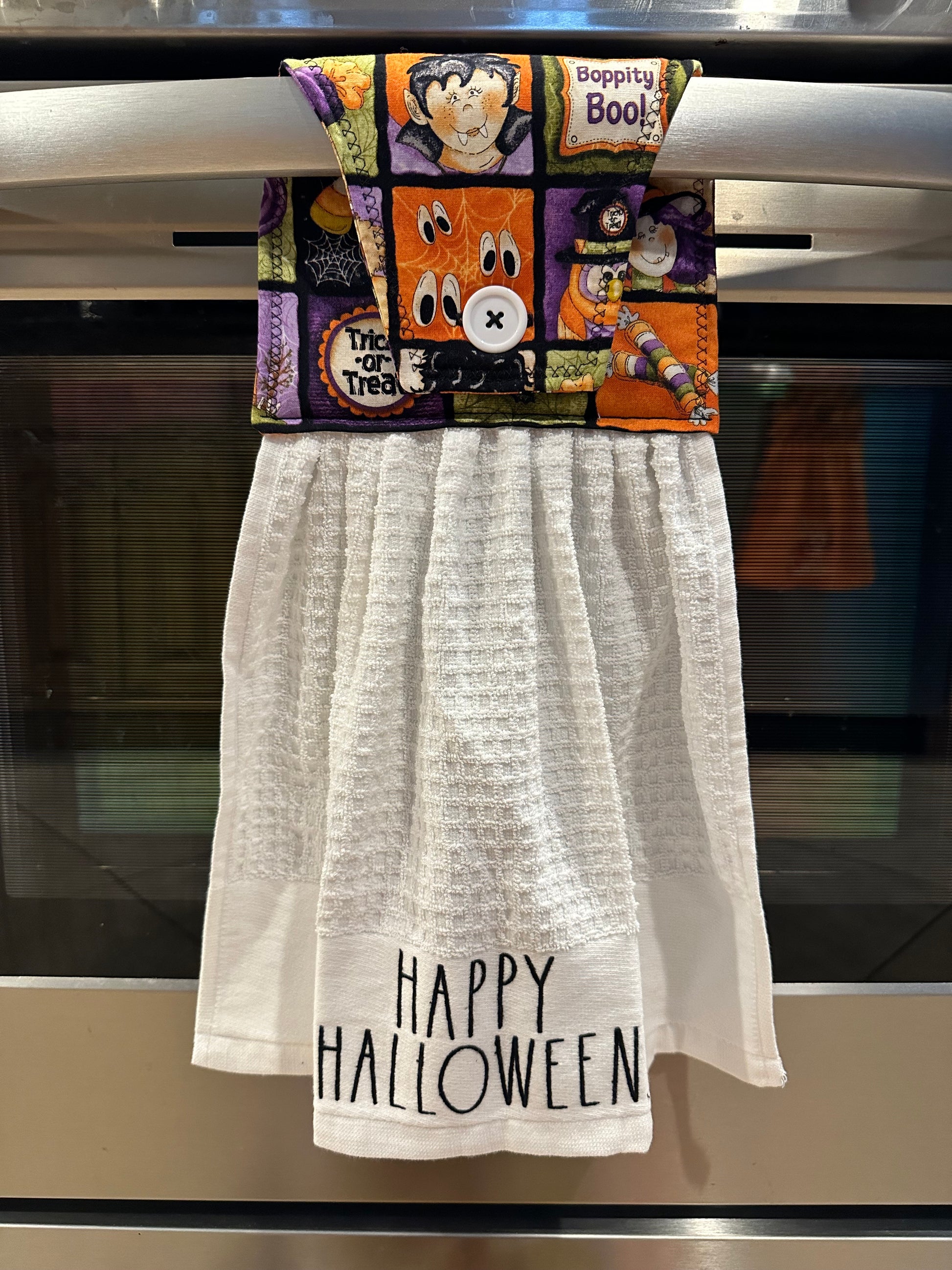 This item is ready to ship to your new home! The perfect housewarming gift! The towel has a hand sewn button for you to easily hang from your stove handle.