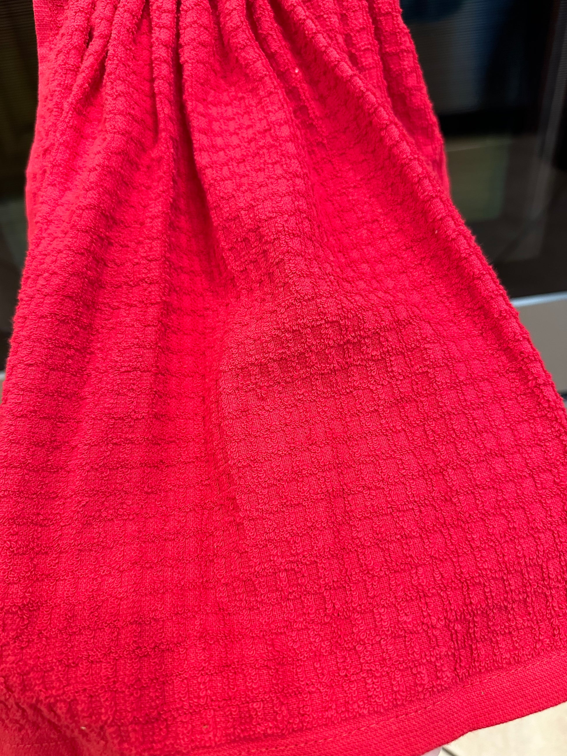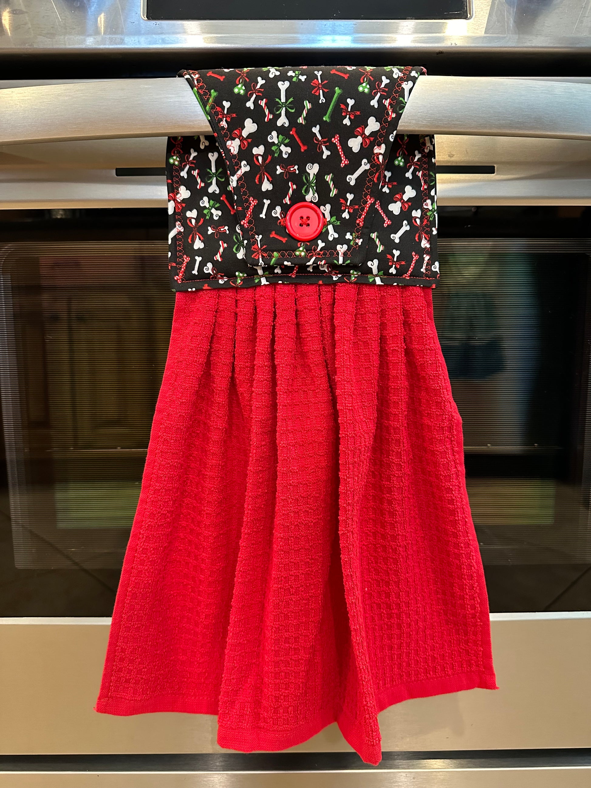 This item is ready to ship to your new home! The perfect housewarming gift! The towel has a hand sewn button for you to easily hang from your stove handle.