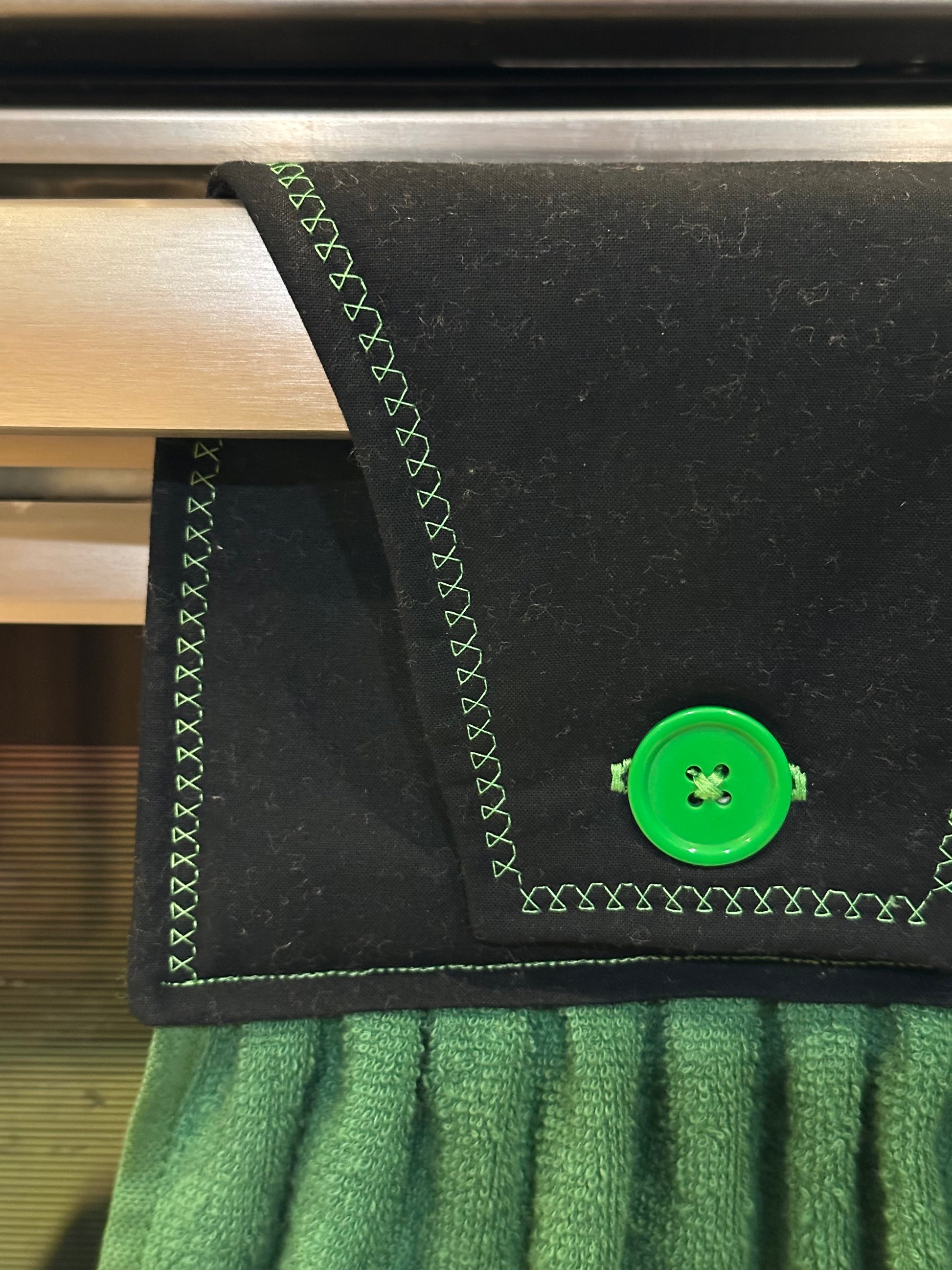 This item is ready to ship to your new home! The perfect housewarming gift! The towel has a hand sewn button for you to easily hang from your stove handle.