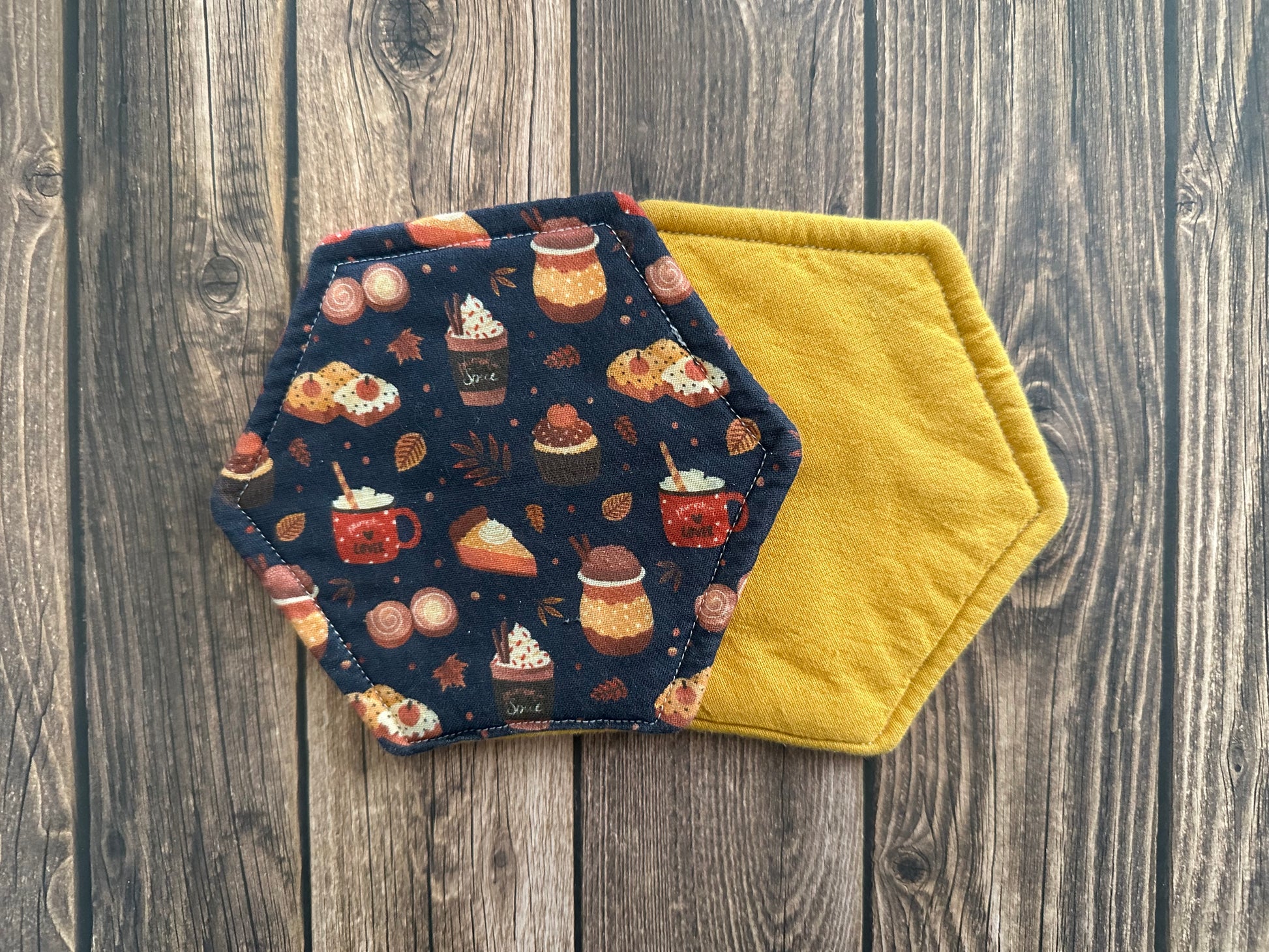 This listing includes a set of four fabric coasters. The coasters are made from 100% cotton fabric with two layers of natural cotton batting. This dual layer will help protect the surfaces of tables from getting ring marks or any heat damage.