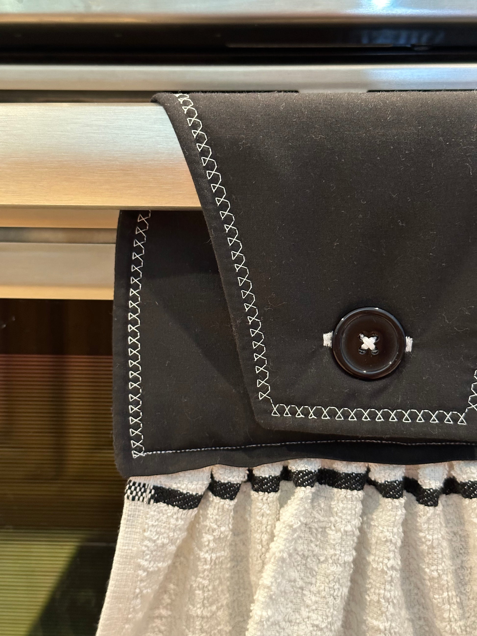 This item is ready to ship to your new home! The perfect housewarming gift! The towel has a hand sewn button for you to easily hang from your stove handle.