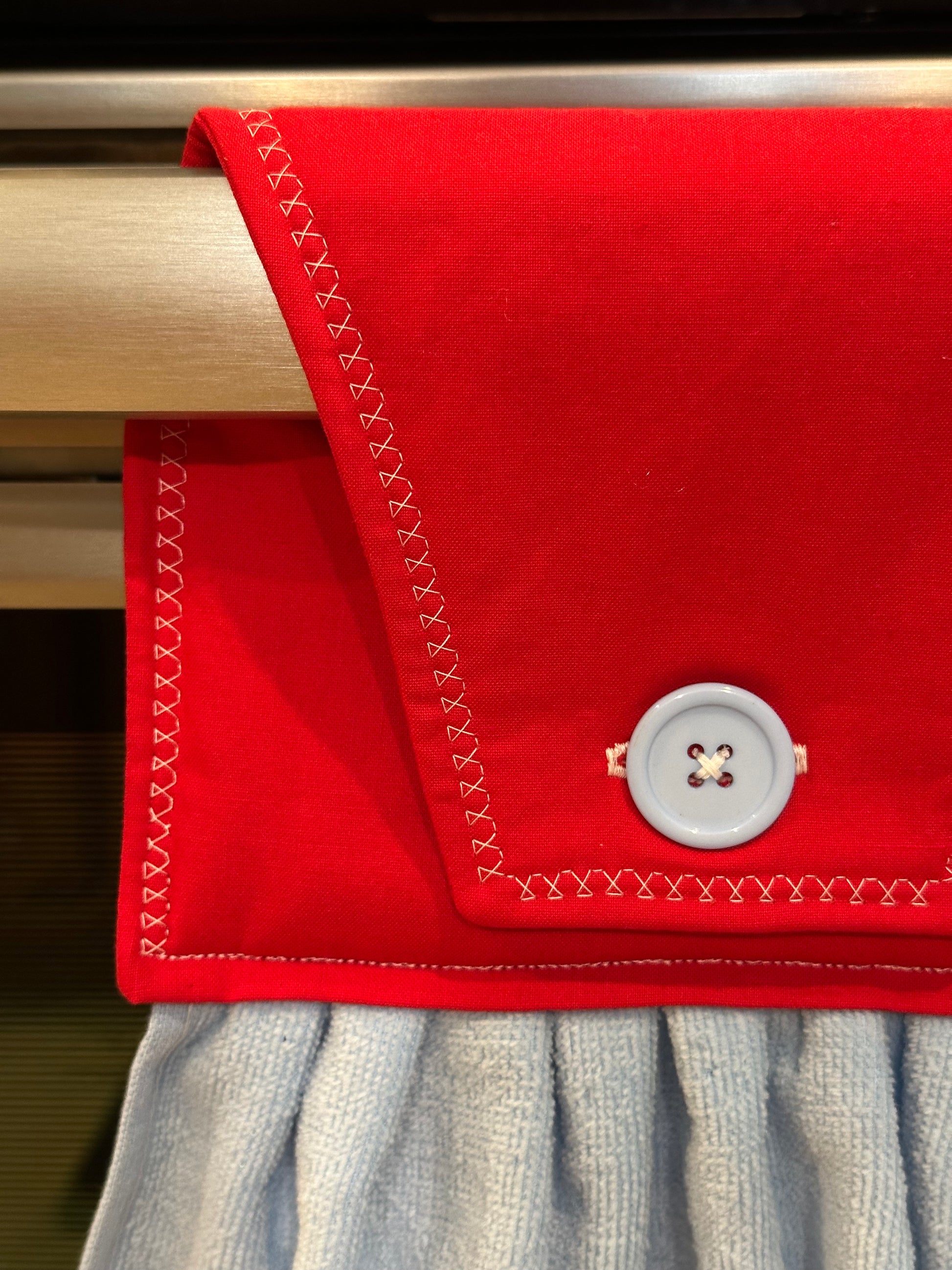 This item is ready to ship to your new home! The perfect housewarming gift! The towel has a hand sewn button for you to easily hang from your stove handle.