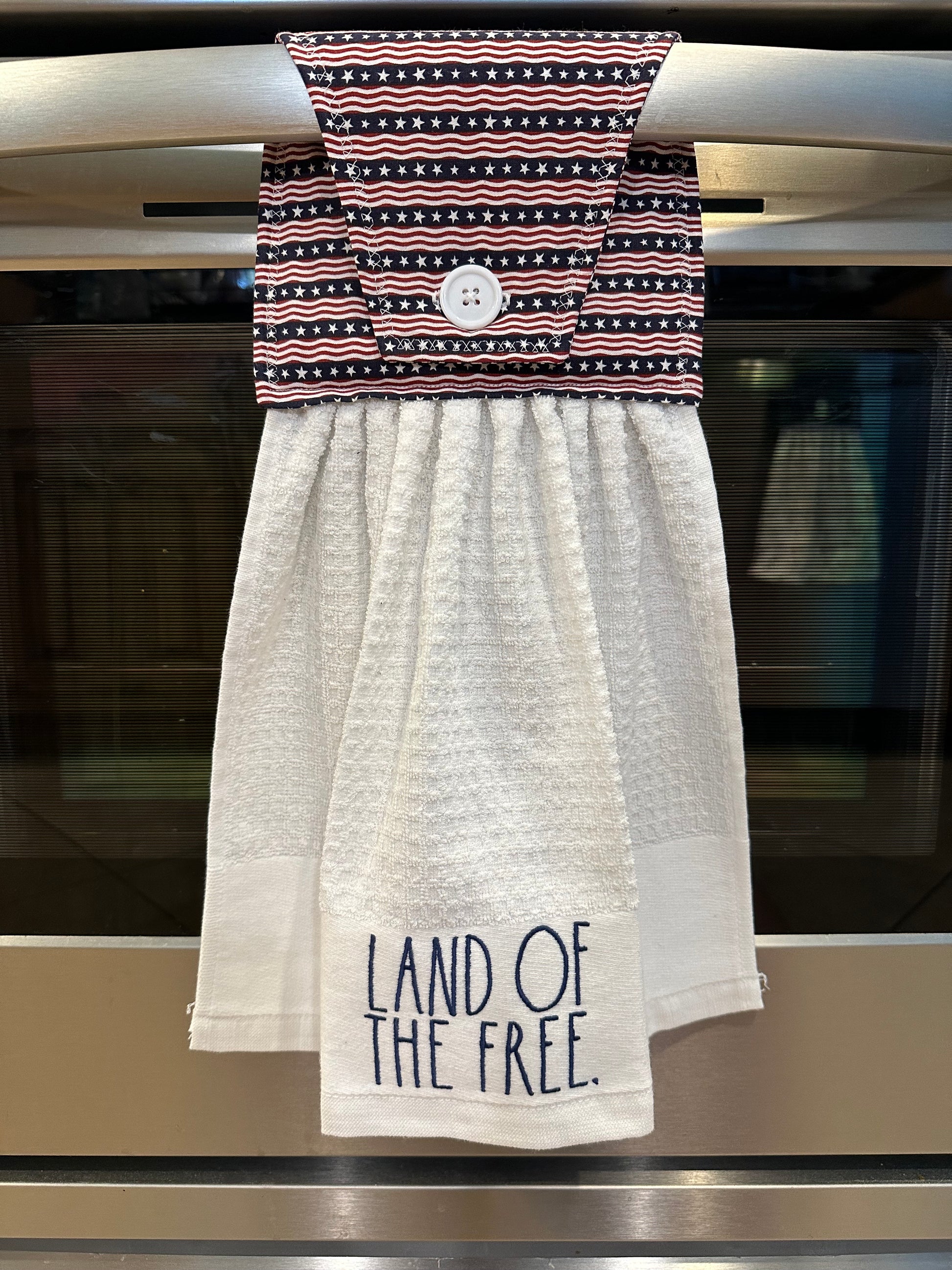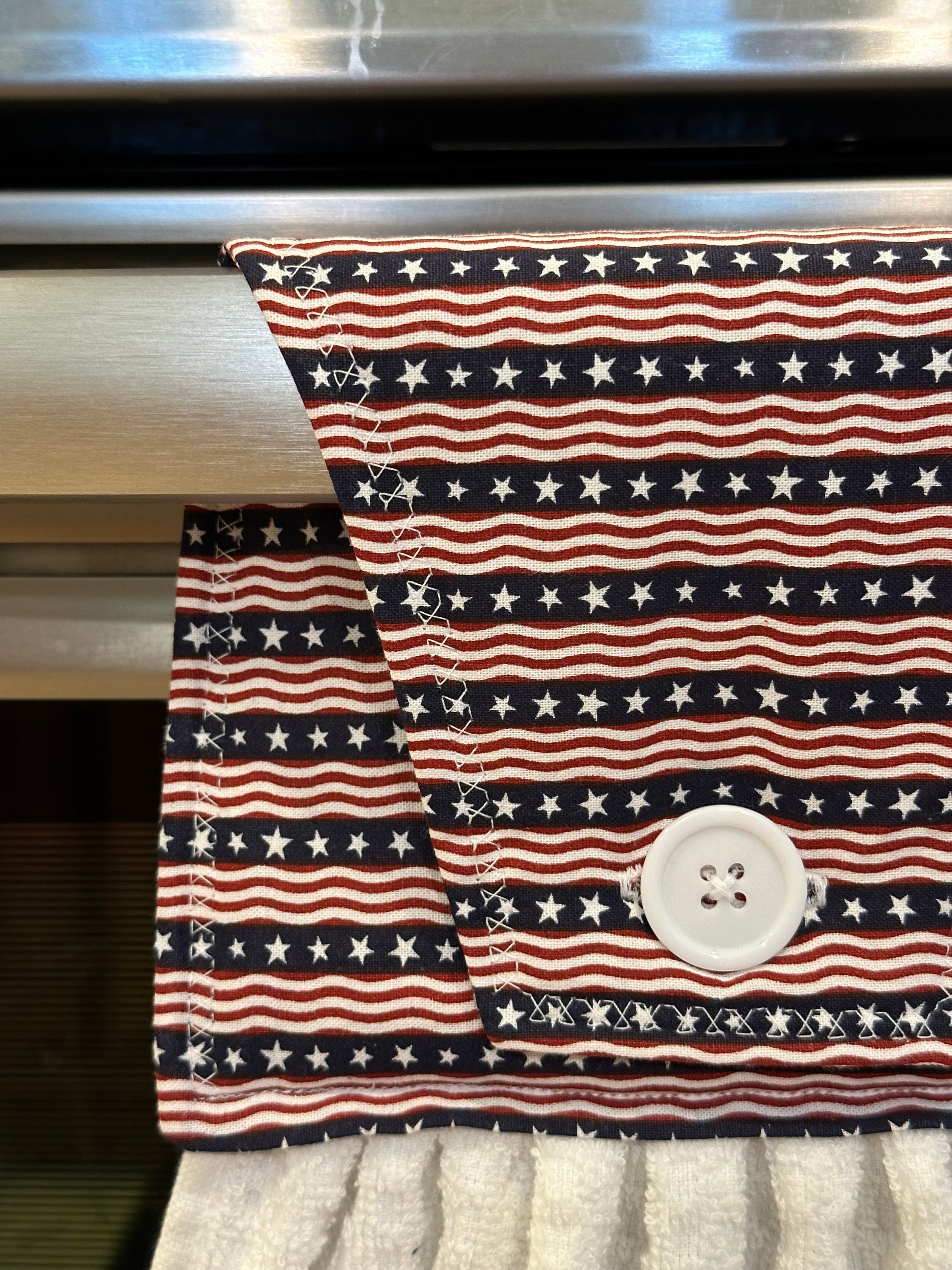 This item is ready to ship to your new home! The perfect housewarming gift! The towel has a hand sewn button for you to easily hang from your stove handle.