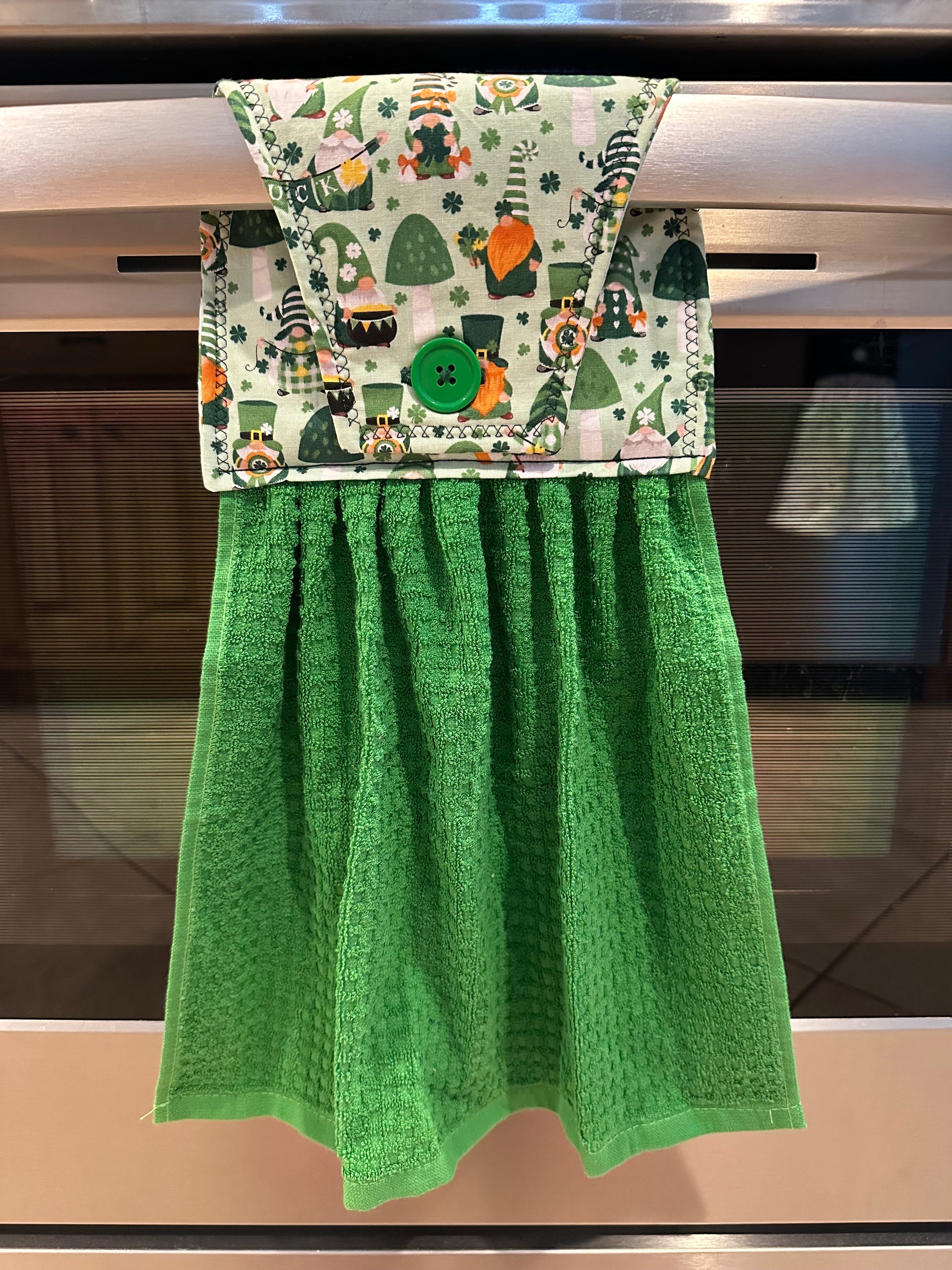 This item is ready to ship to your new home! The perfect housewarming gift! The towel has a hand sewn button for you to easily hang from your stove handle.