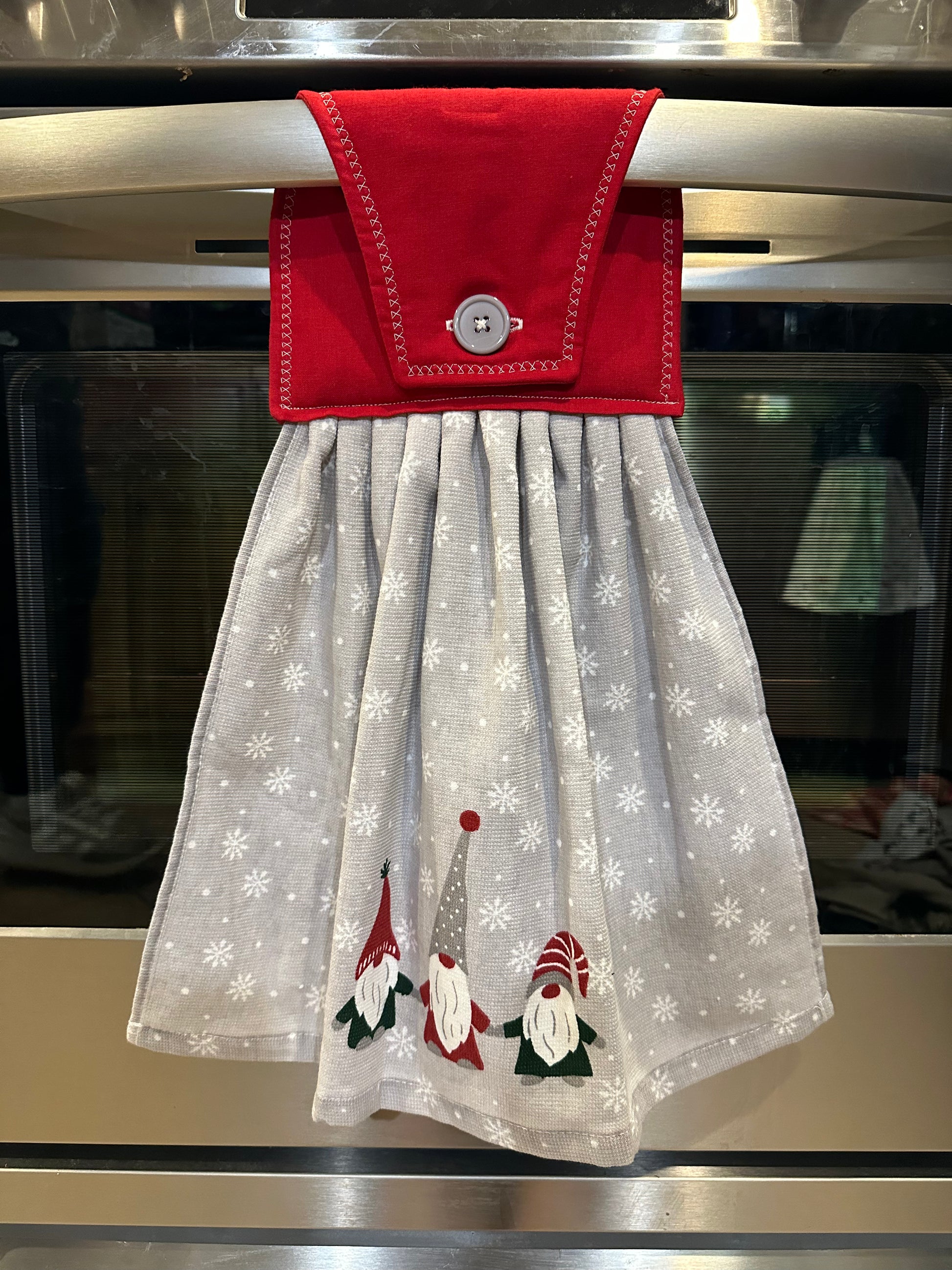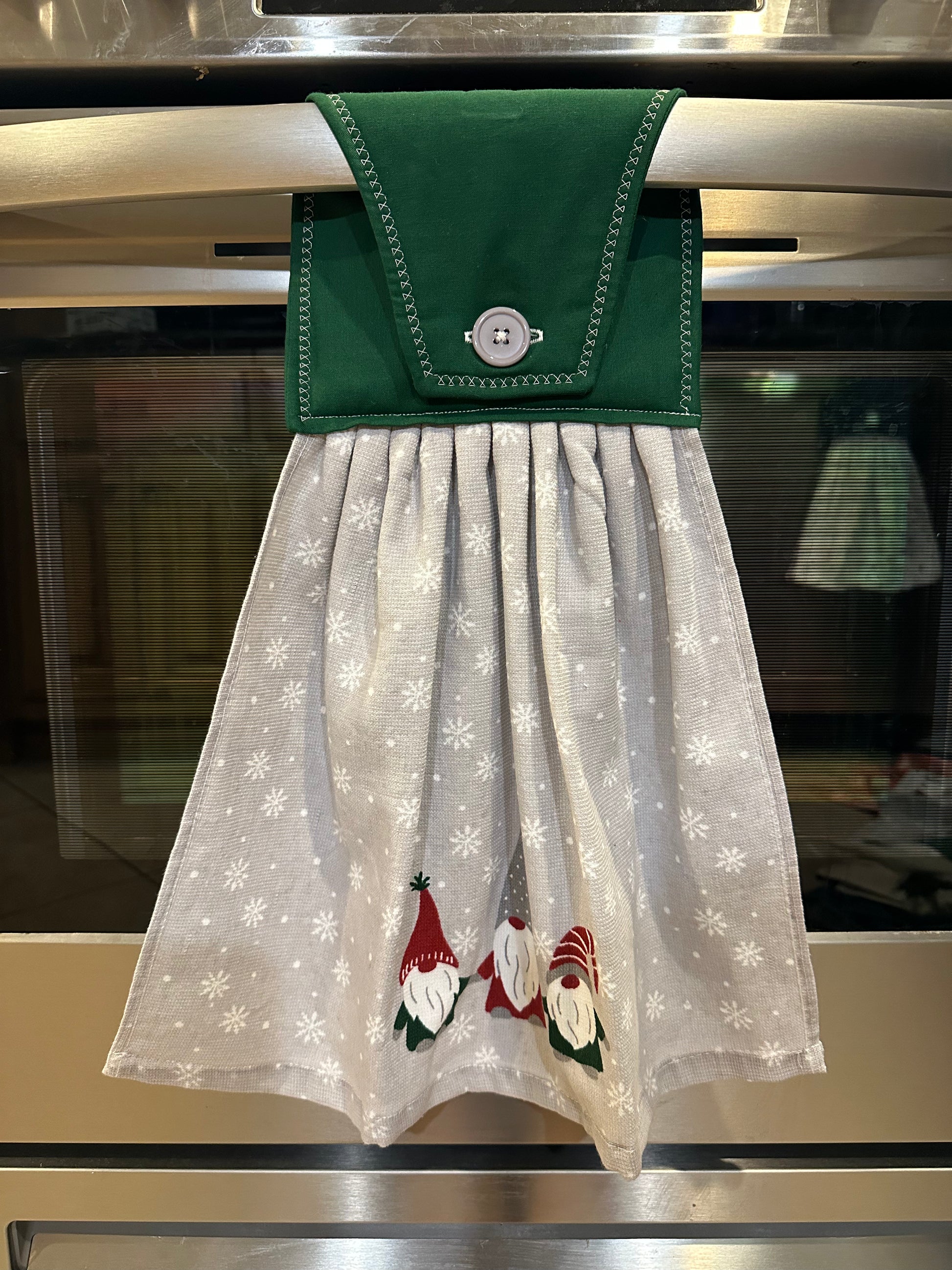 This item is ready to ship to your new home! The perfect housewarming gift! The towel has a hand sewn button for you to easily hang from your stove handle.
