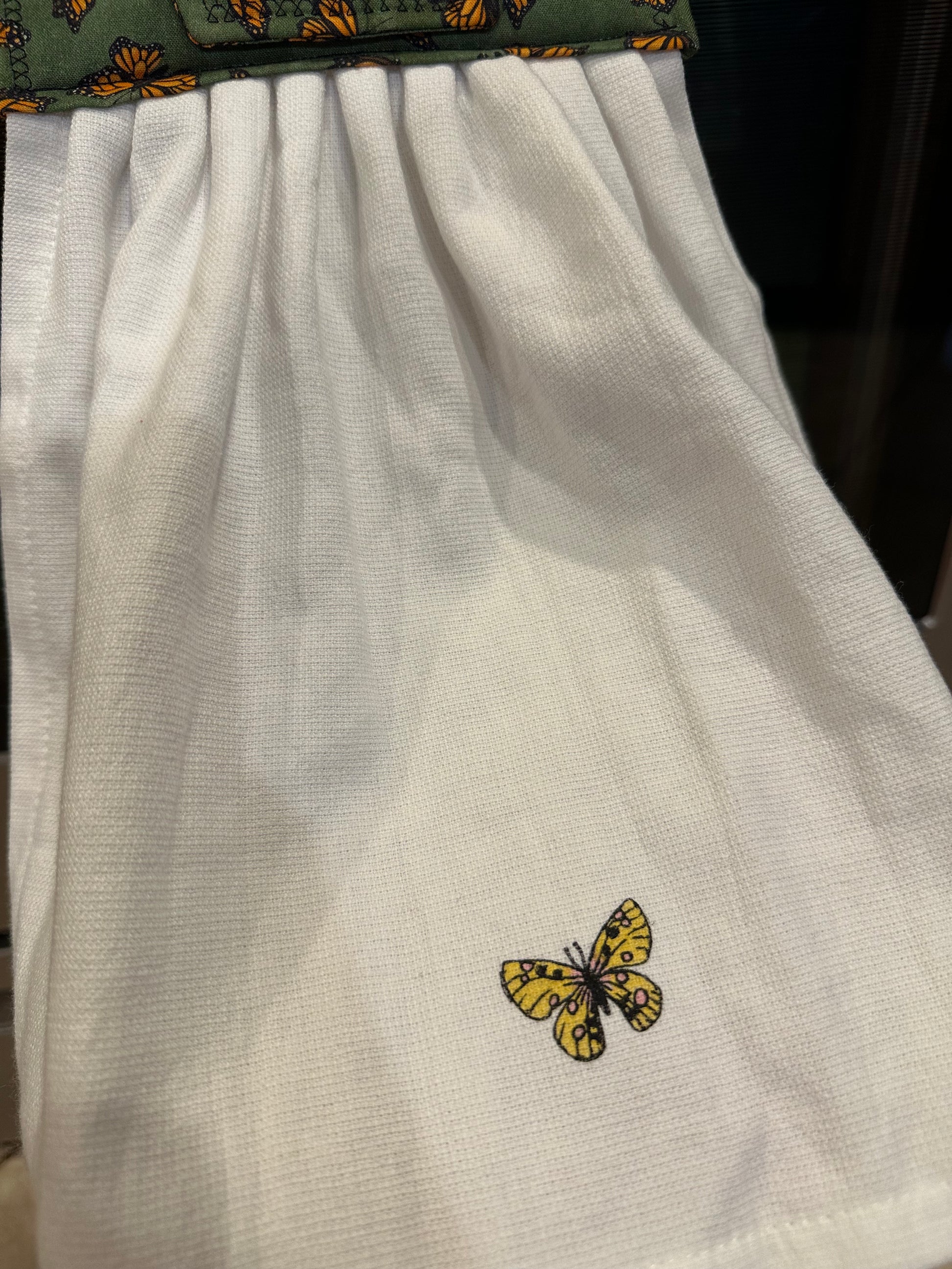 This item is ready to ship to your new home! The perfect housewarming gift! The towel has a hand sewn button for you to easily hang from your stove handle.