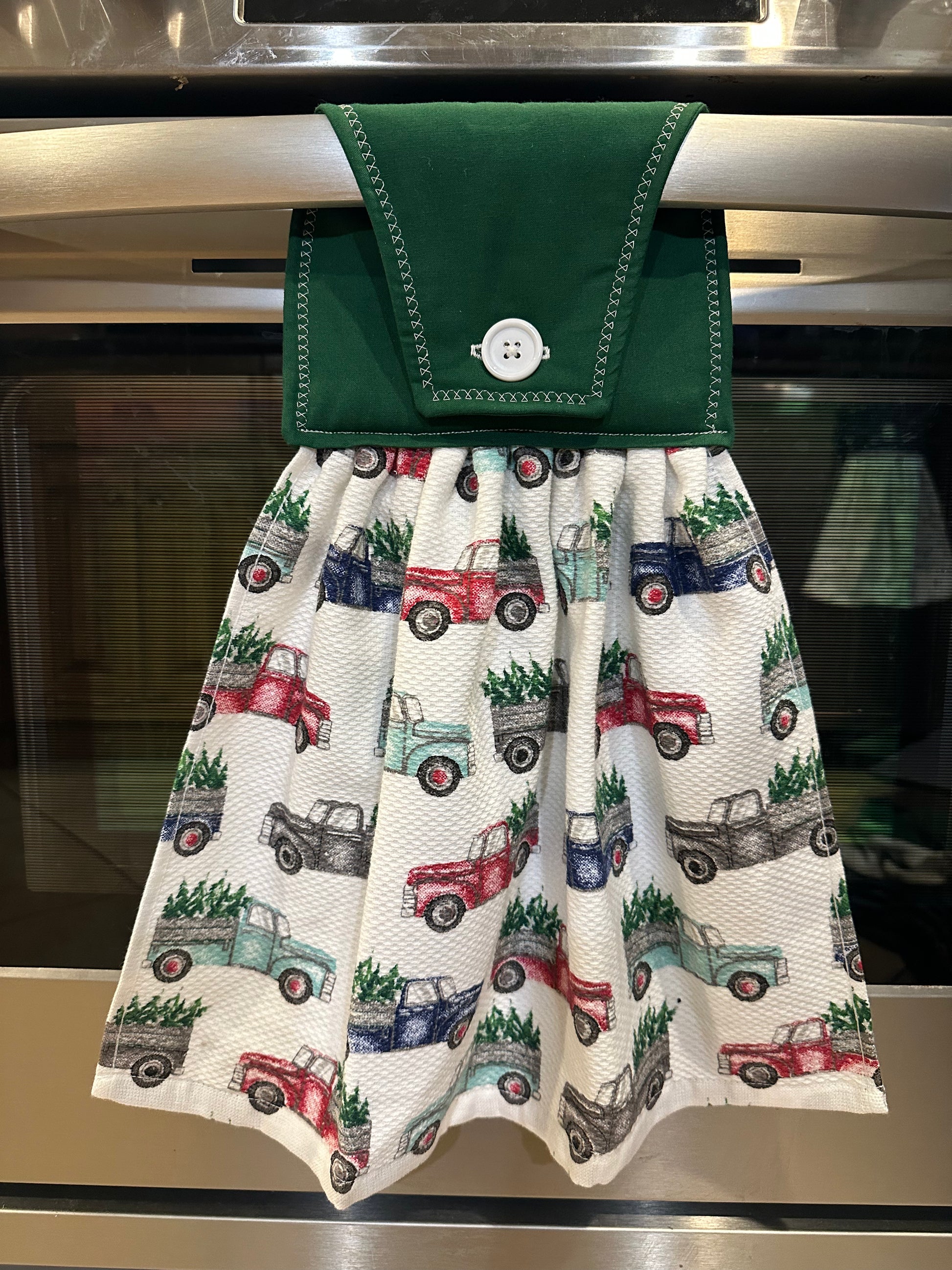 This item is ready to ship to your new home! The perfect housewarming gift! The towel has a hand sewn button for you to easily hang from your stove handle.