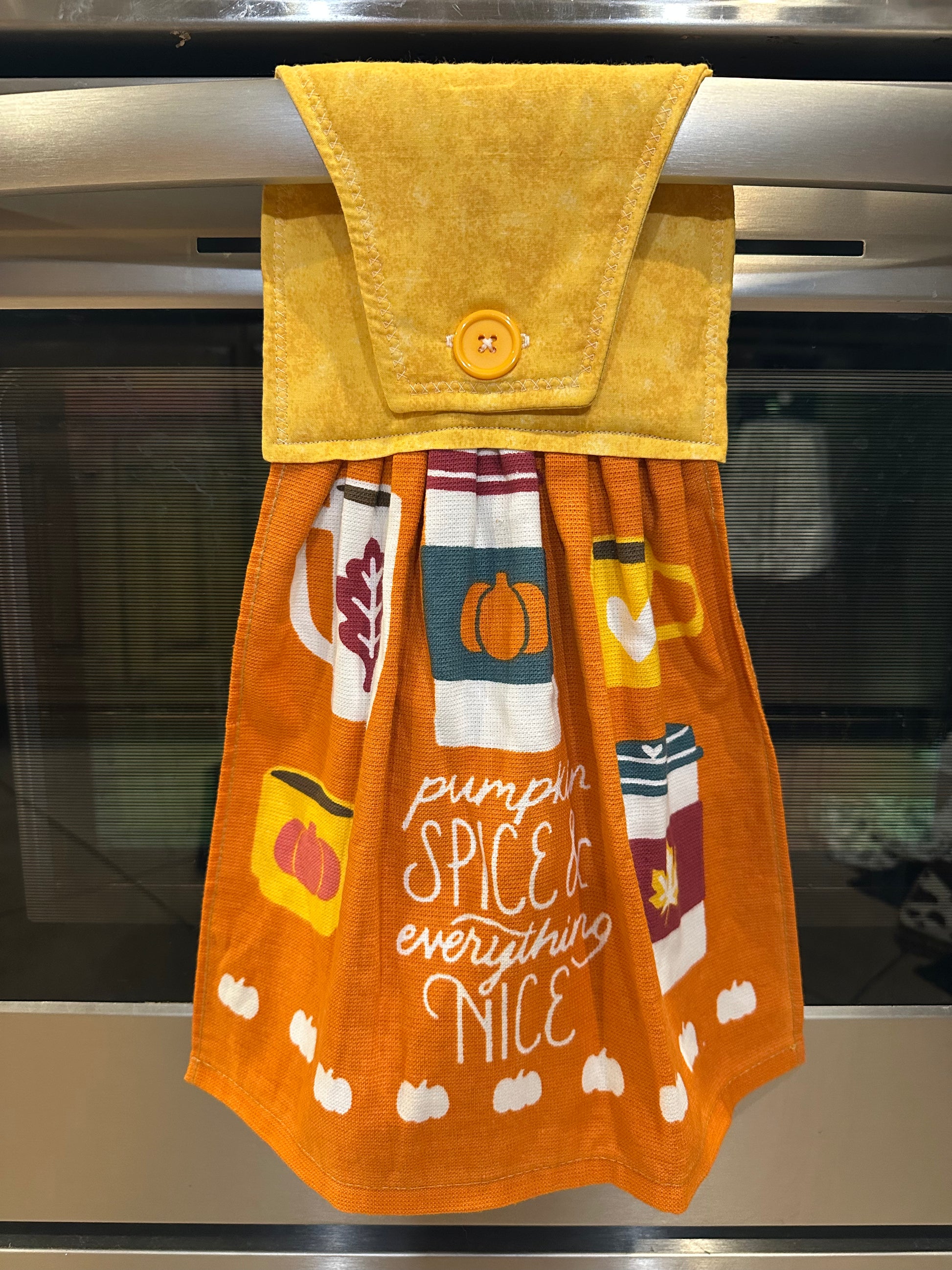 This item is ready to ship to your new home! The perfect housewarming gift! The towel has a hand sewn button for you to easily hang from your stove handle.