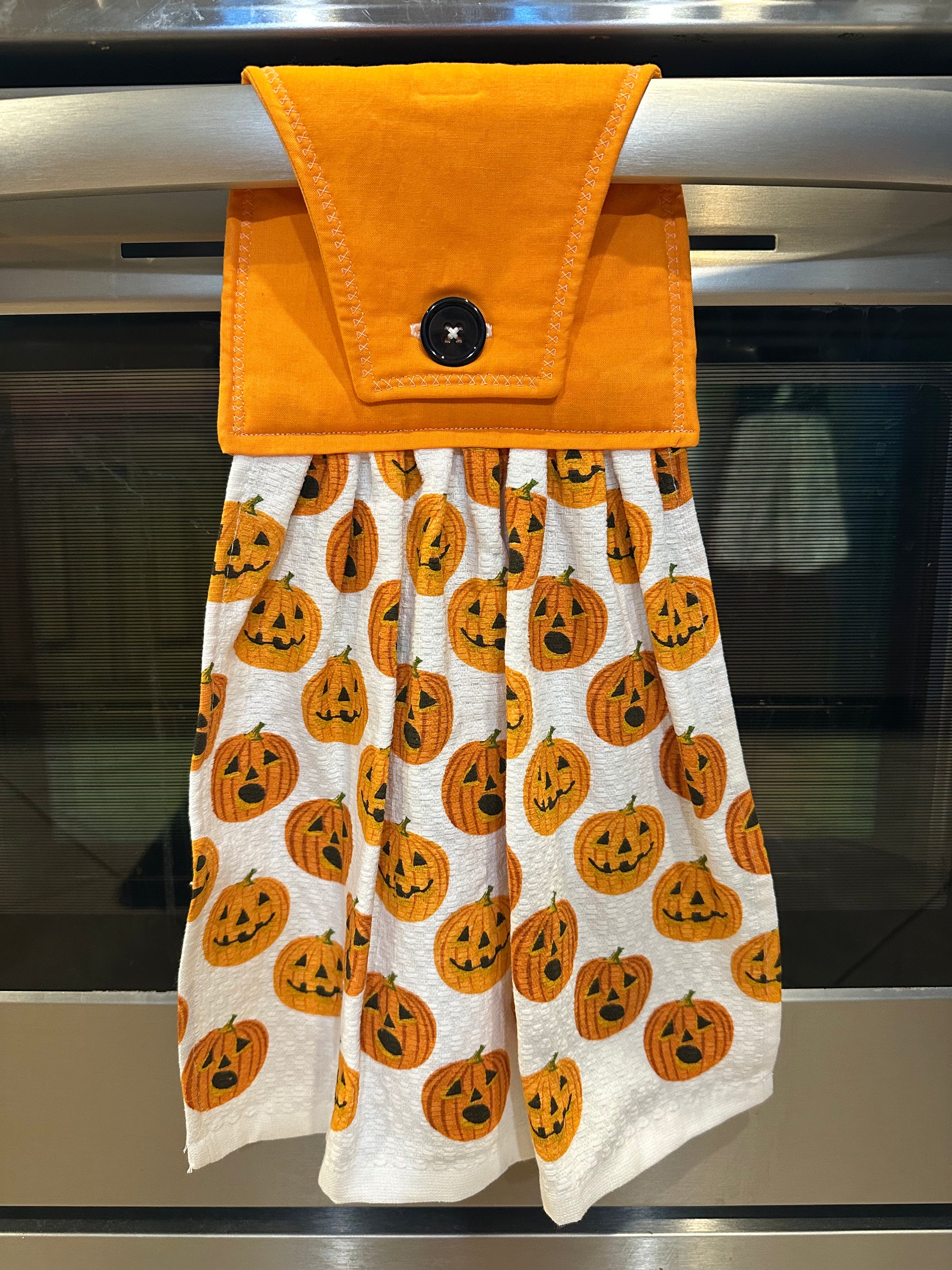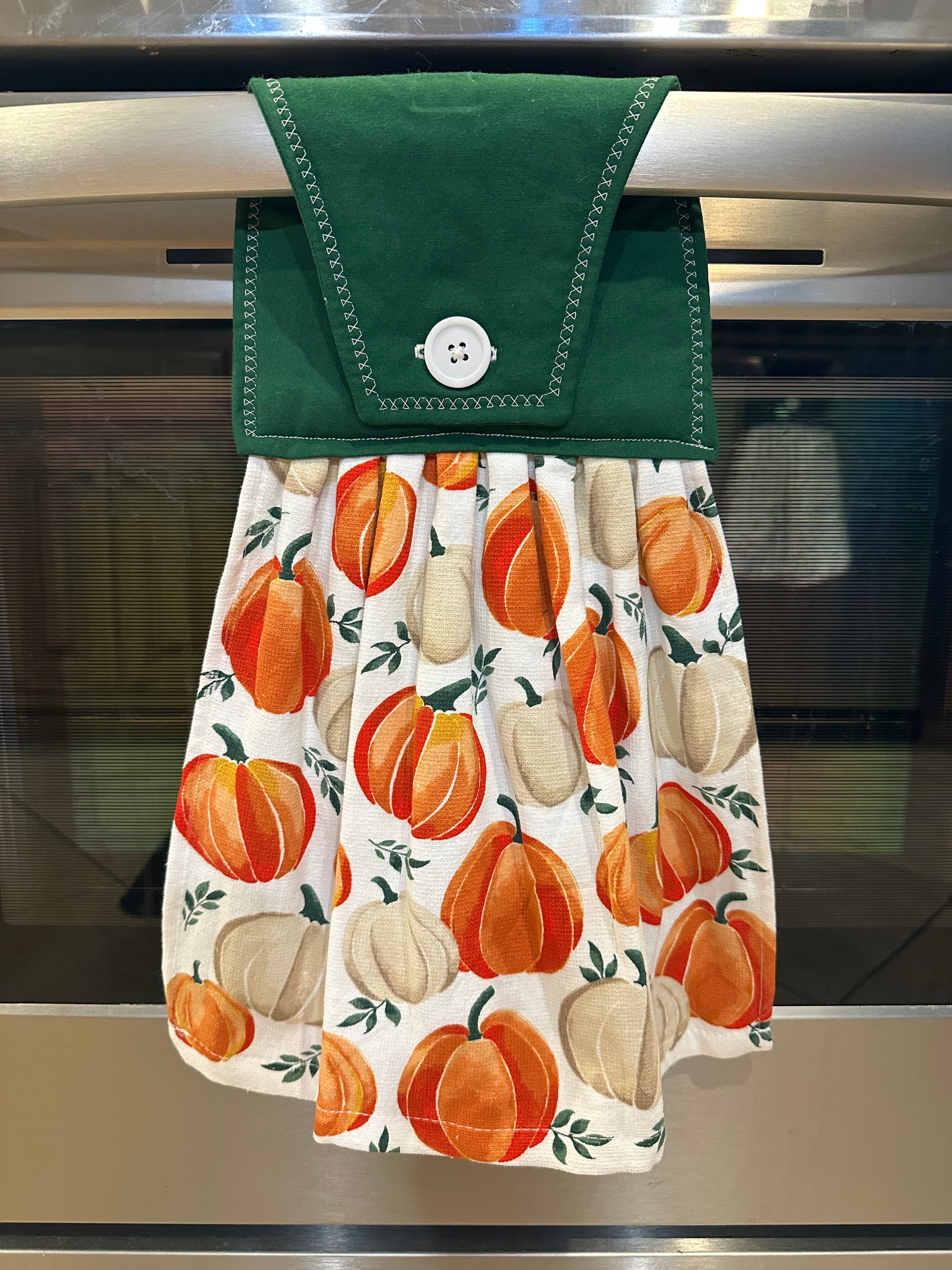 This item is ready to ship to your new home! The perfect housewarming gift! The towel has a hand sewn button for you to easily hang from your stove handle.