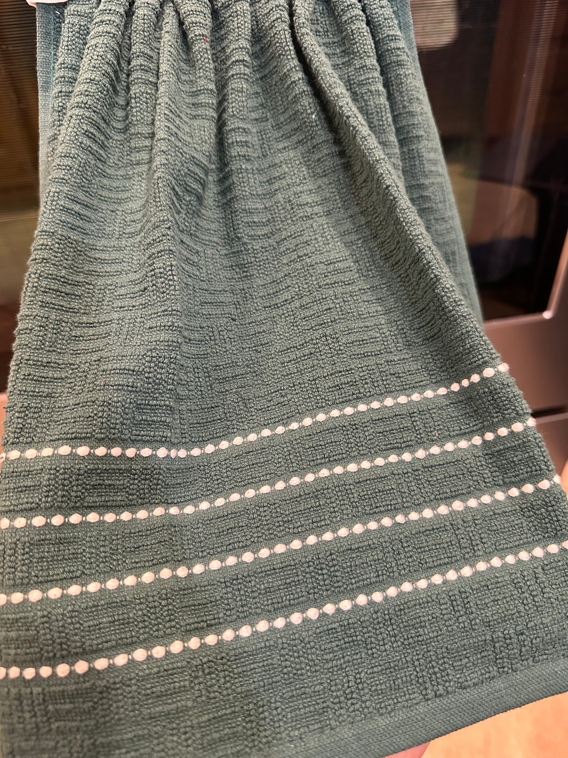 This item is ready to ship to your new home! The perfect housewarming gift! The towel has a hand sewn button for you to easily hang from your stove handle.