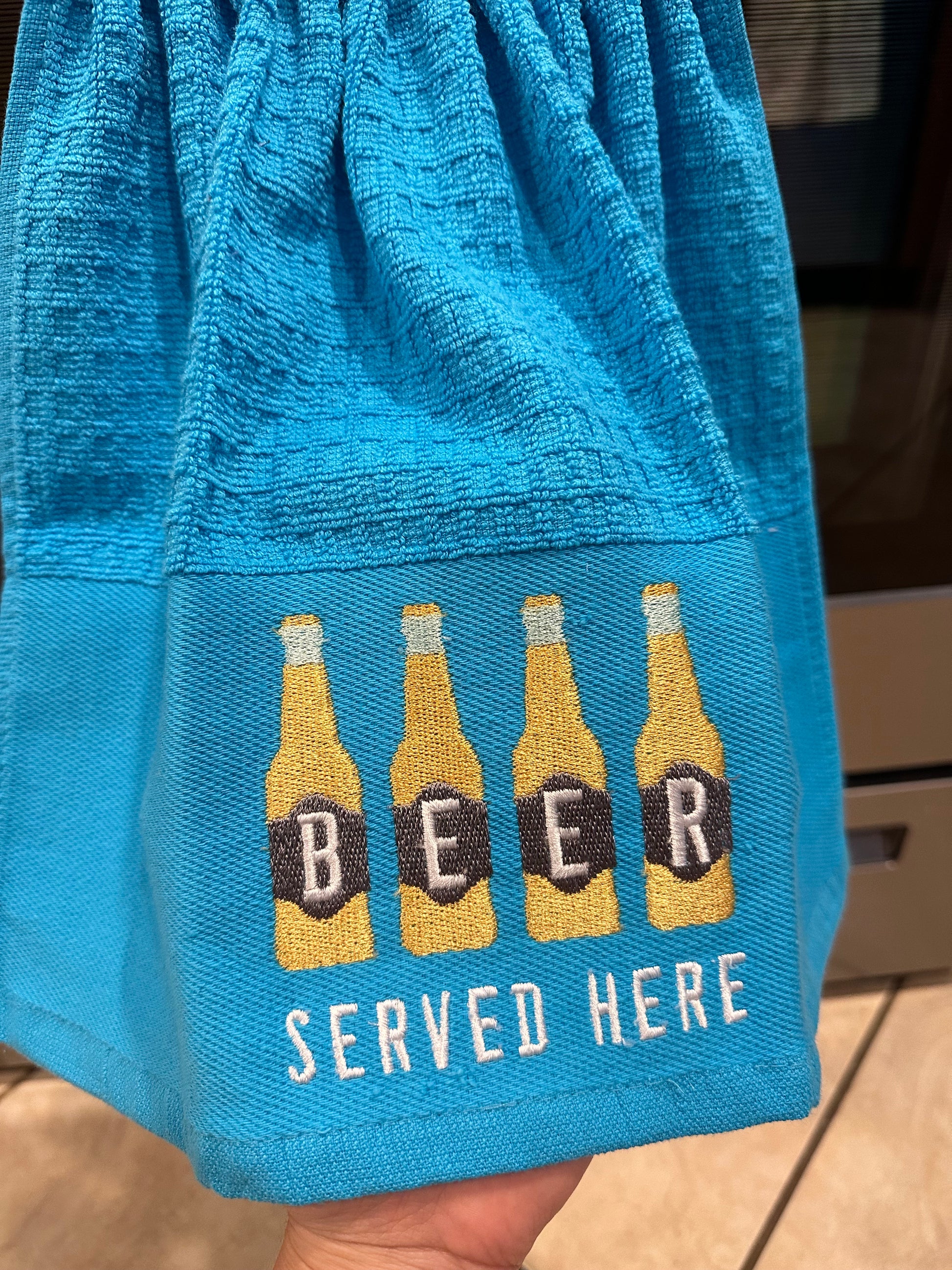 This item is ready to ship to your new home! The perfect housewarming gift! The towel has a hand sewn button for you to easily hang from your stove handle.