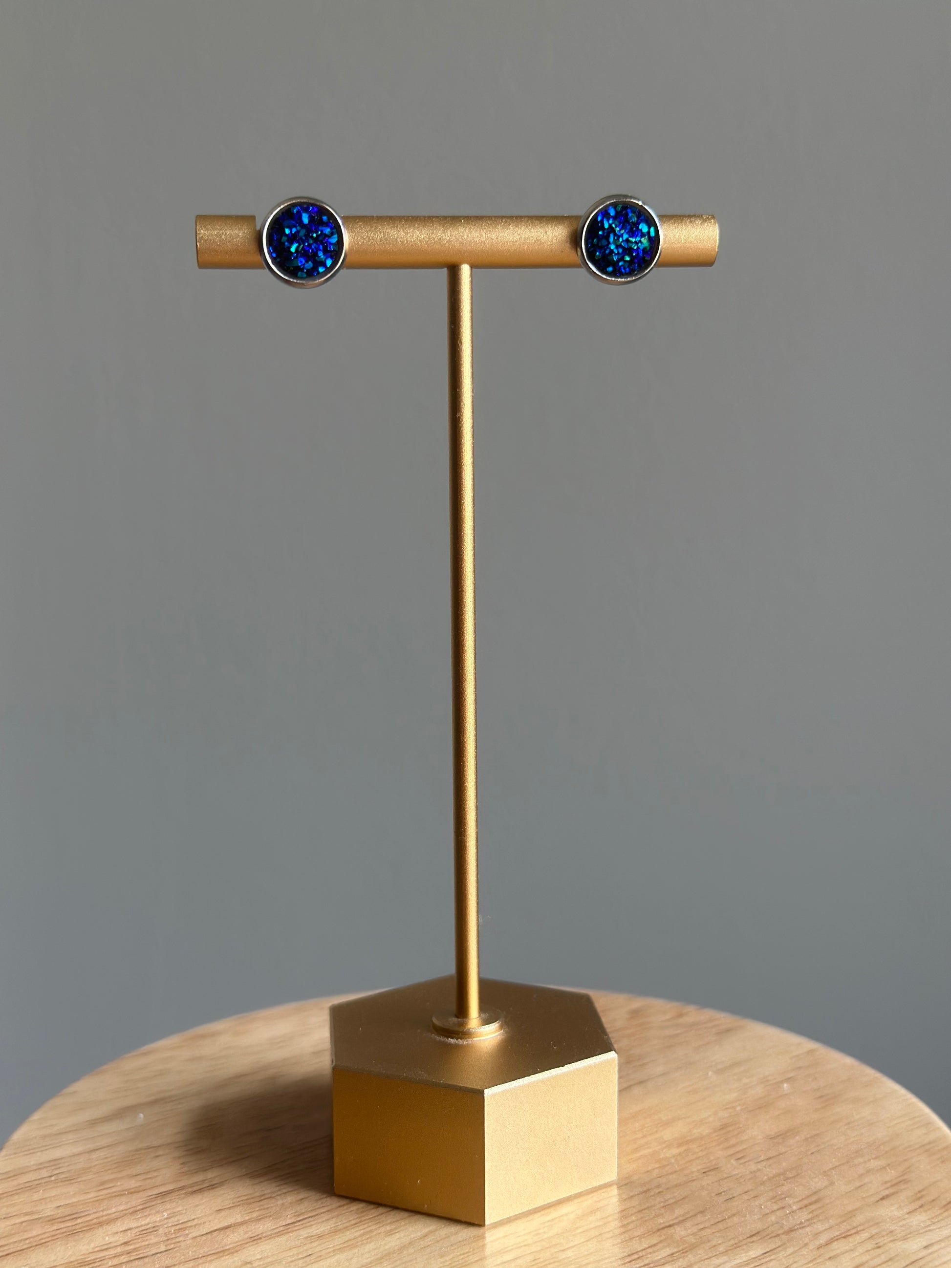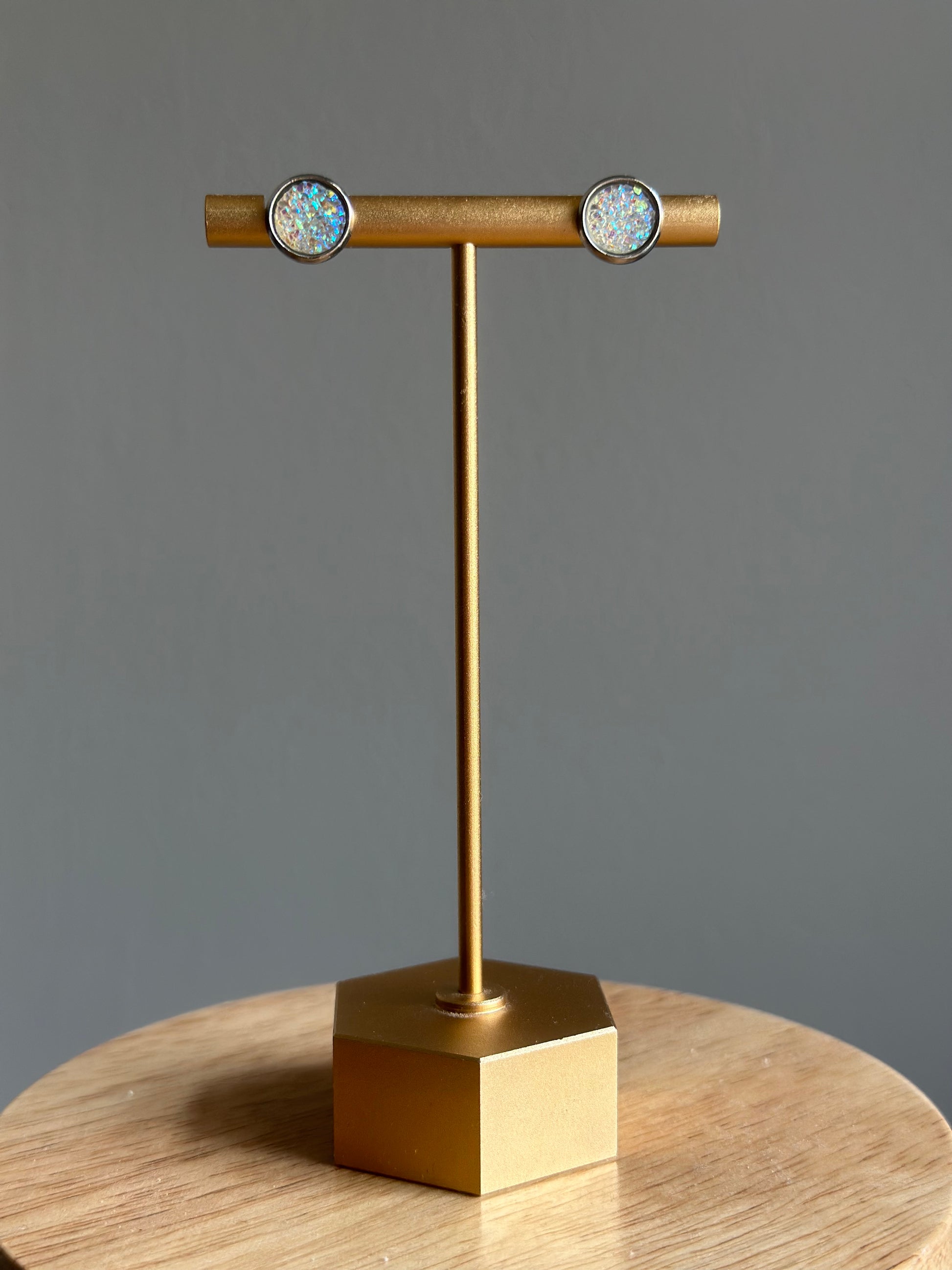 I use a 8mm silver stainless steel framed stud post. Stainless steel is great for those who have sensitive ears. You will receive a metal and rubber backing for each pair. You will never receive jewelry that has been worn!