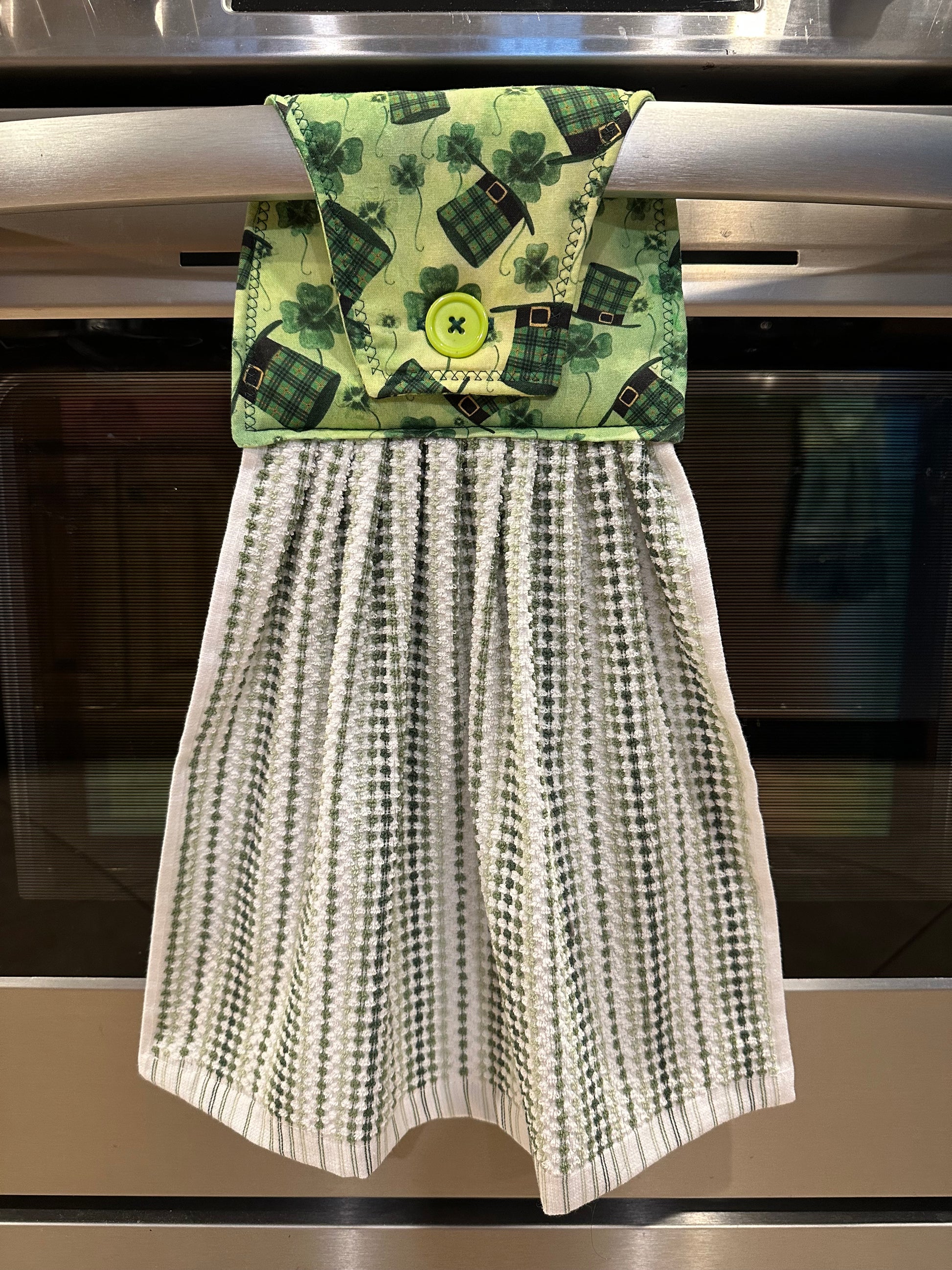 This item is ready to ship to your new home! The perfect housewarming gift! The towel has a hand sewn button for you to easily hang from your stove handle.