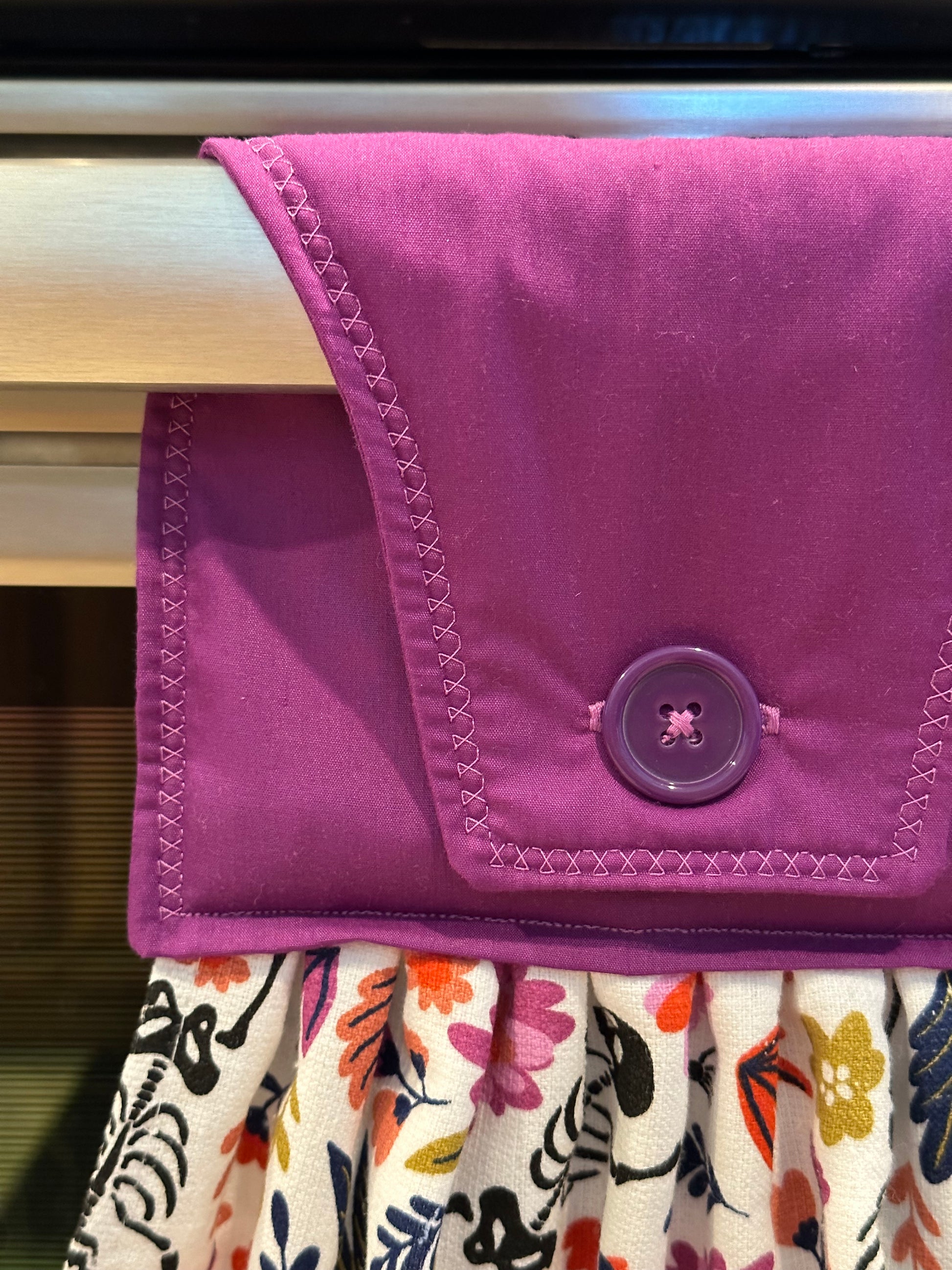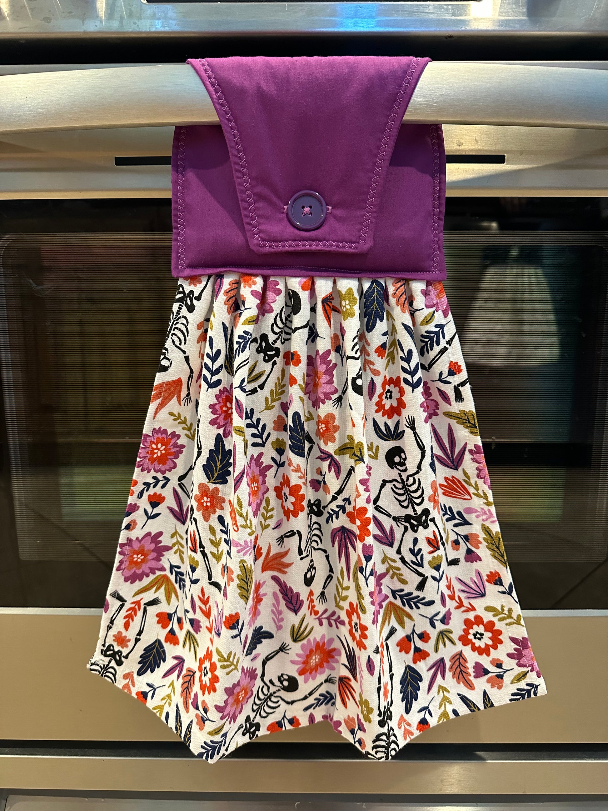 This item is ready to ship to your new home! The perfect housewarming gift! The towel has a hand sewn button for you to easily hang from your stove handle.