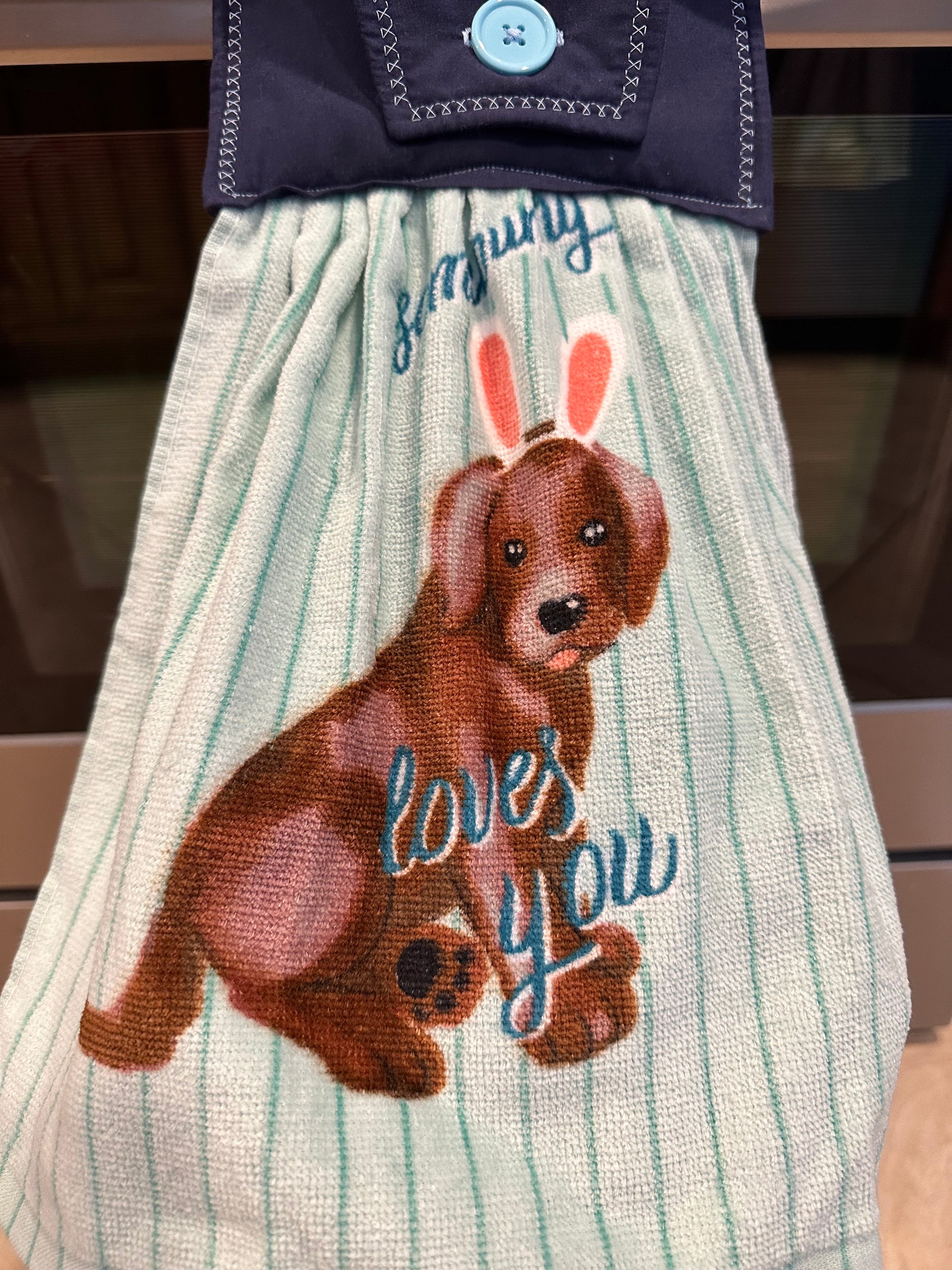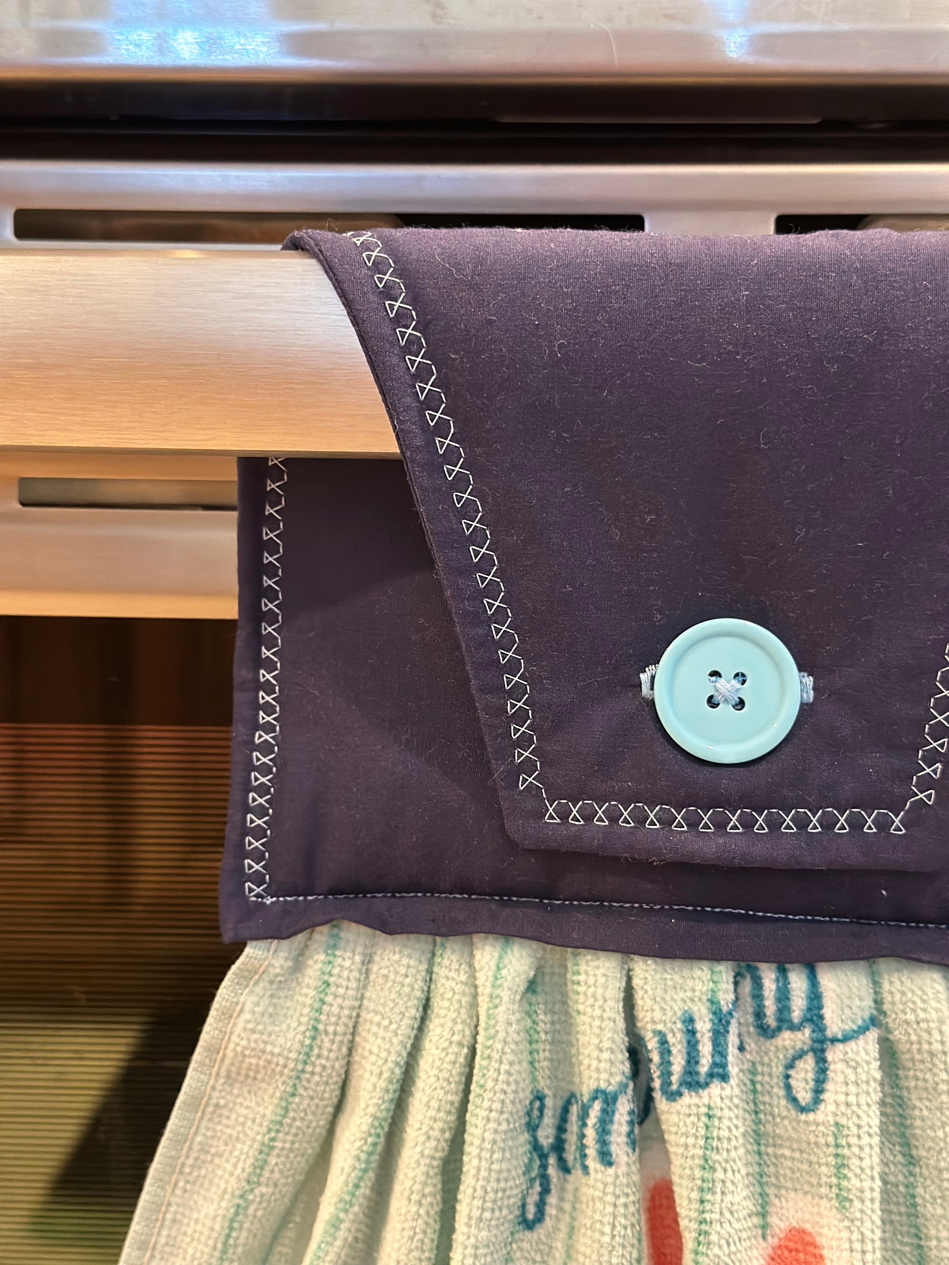 This item is ready to ship to your new home! The perfect housewarming gift! The towel has a hand sewn button for you to easily hang from your stove handle.