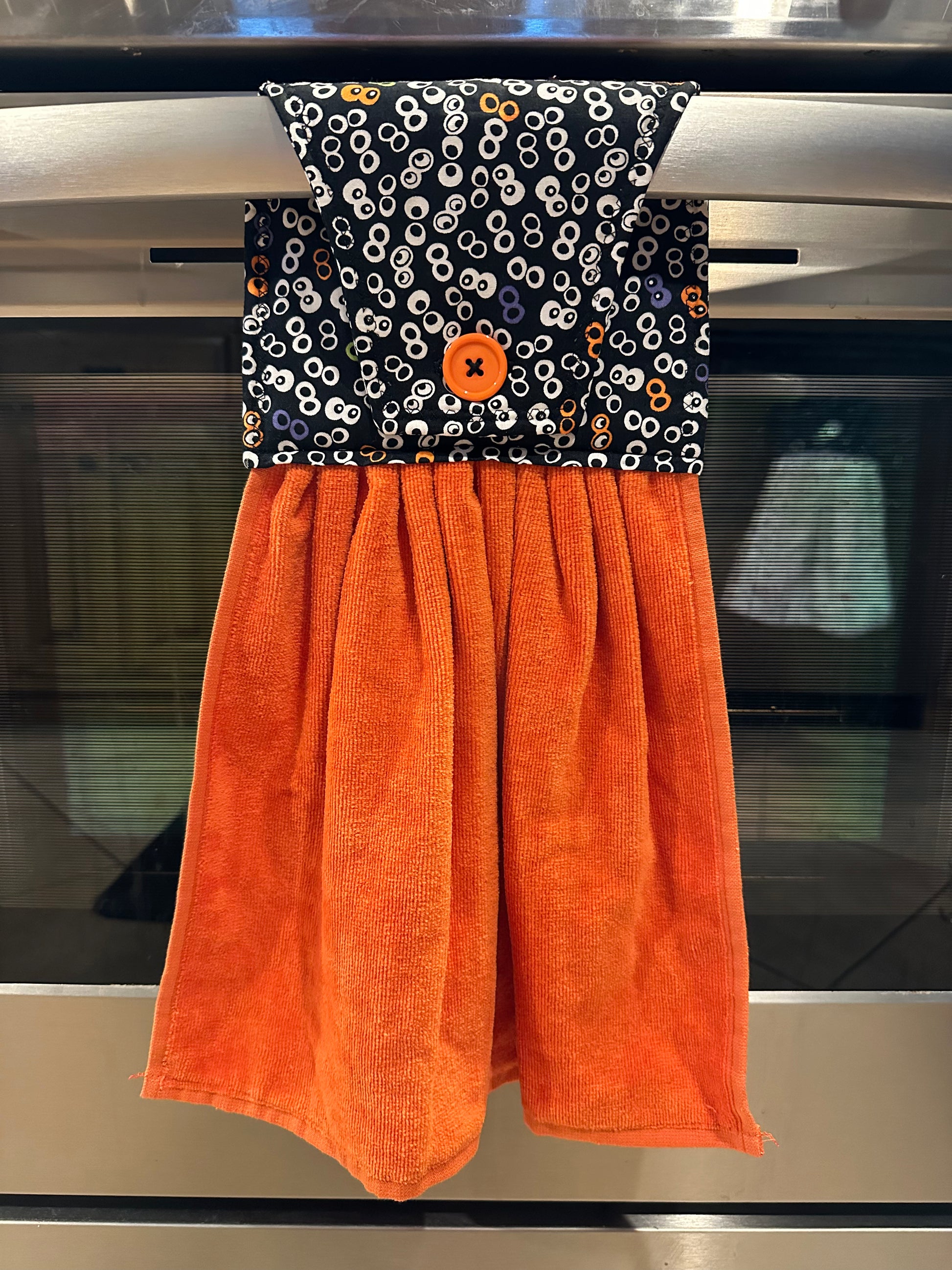 This item is ready to ship to your new home! The perfect housewarming gift! The towel has a hand sewn button for you to easily hang from your stove handle.