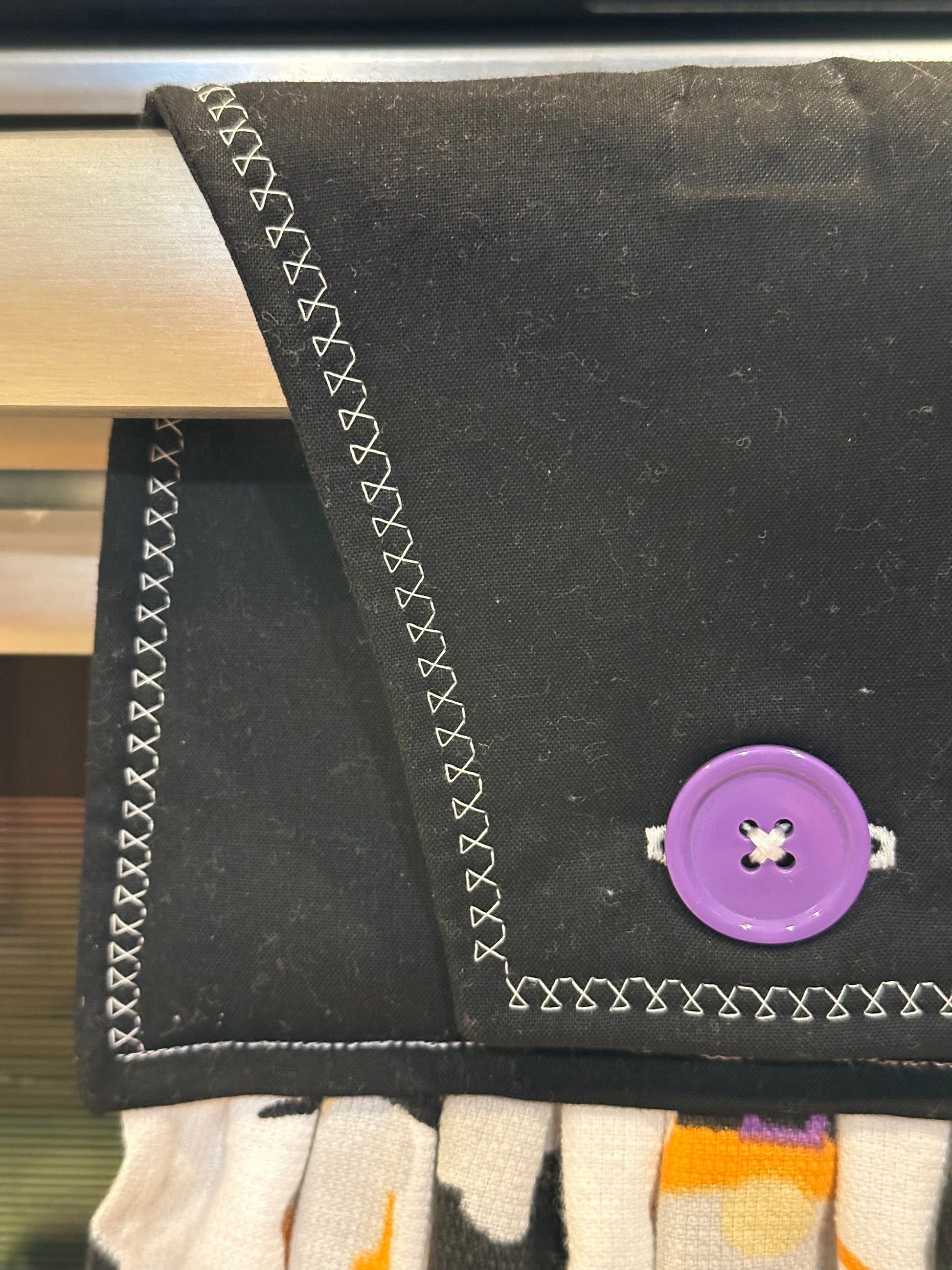 This item is ready to ship to your new home! The perfect housewarming gift! The towel has a hand sewn button for you to easily hang from your stove handle.