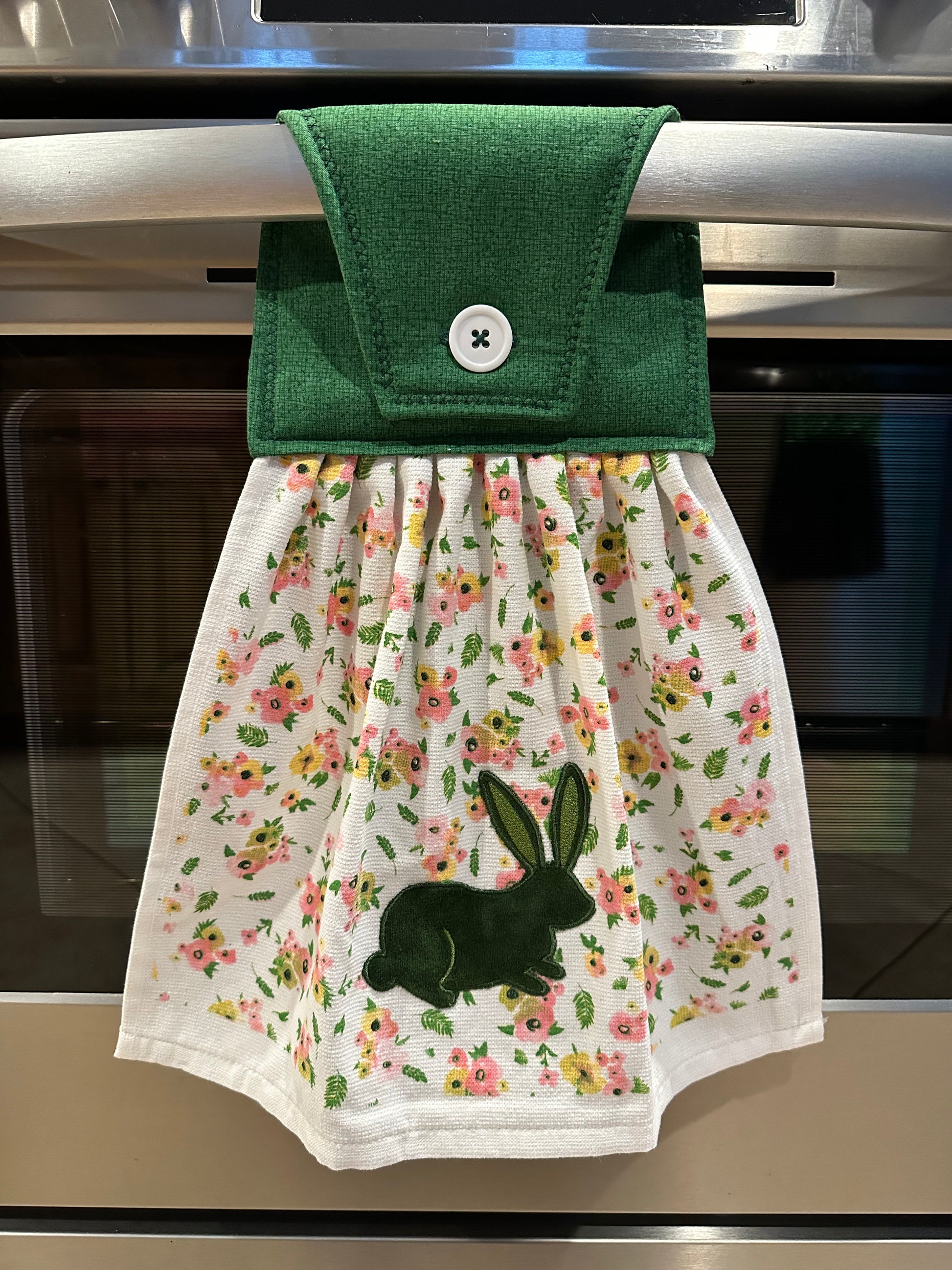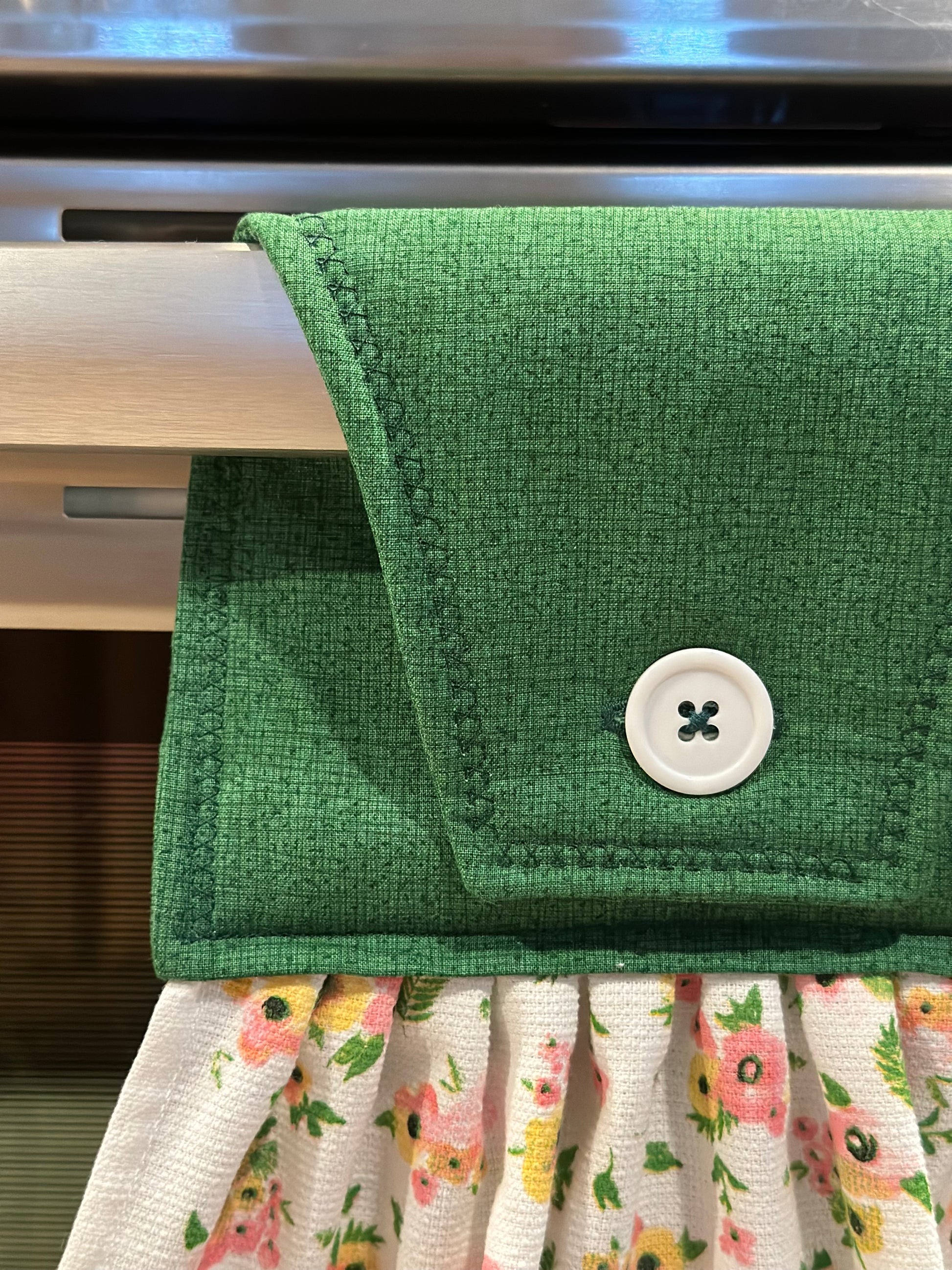 This item is ready to ship to your new home! The perfect housewarming gift! The towel has a hand sewn button for you to easily hang from your stove handle.