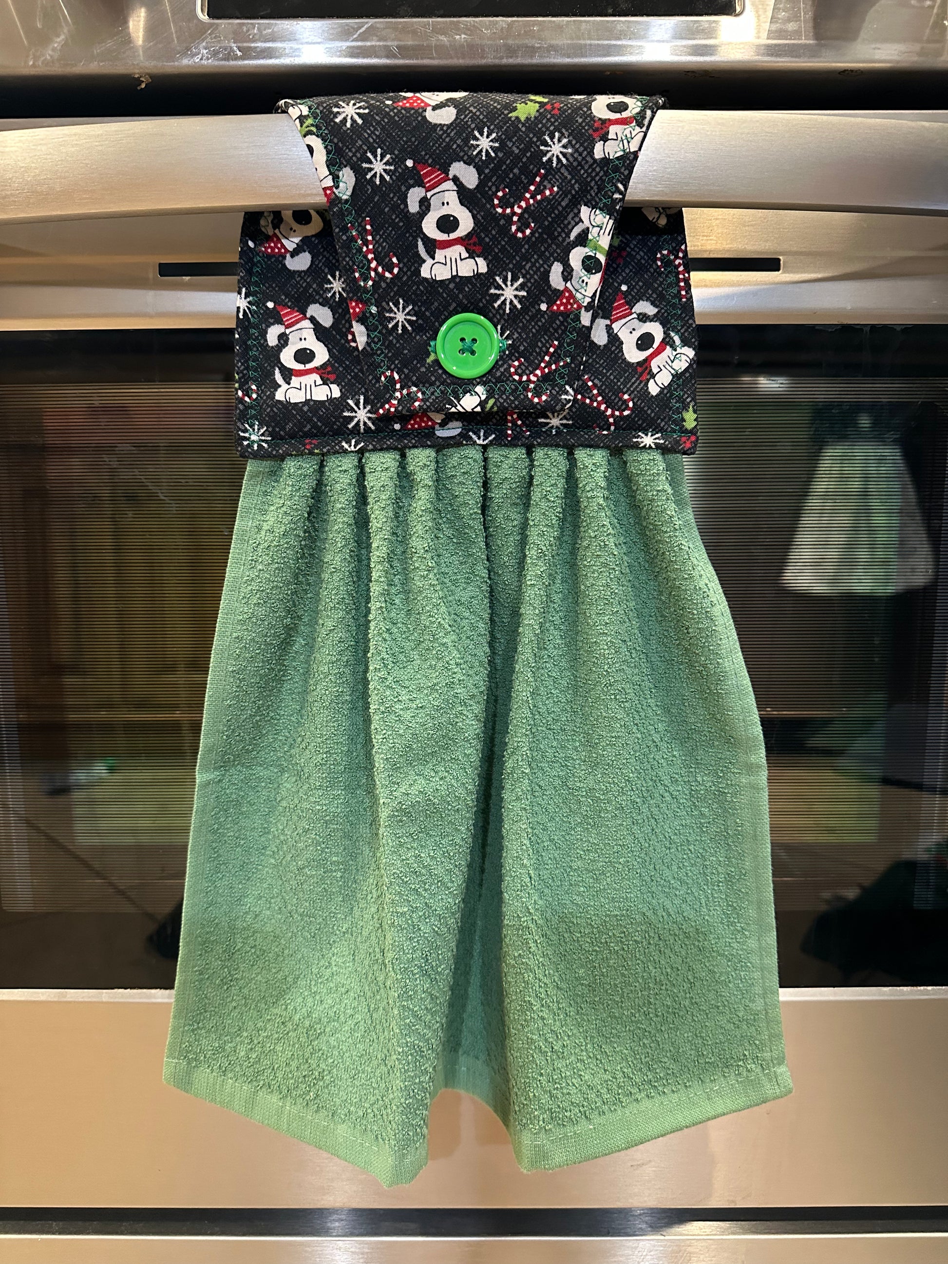 This item is ready to ship to your new home! The perfect housewarming gift! The towel has a hand sewn button for you to easily hang from your stove handle.