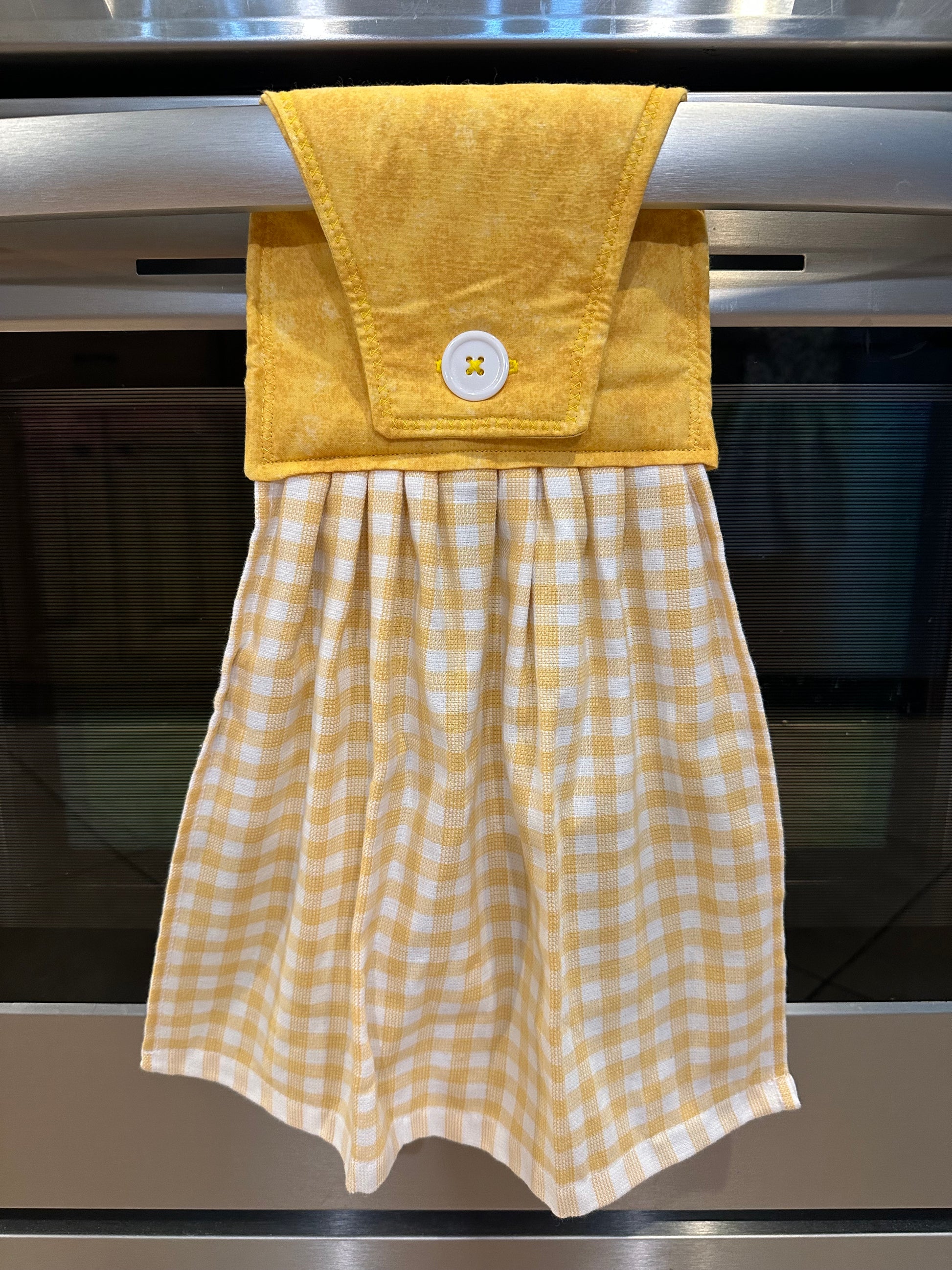 This item is ready to ship to your new home! The perfect housewarming gift! The towel has a hand sewn button for you to easily hang from your stove handle.